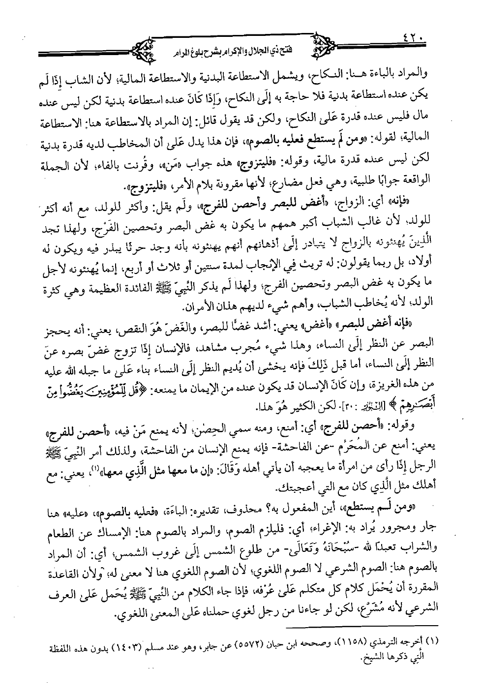 «ومن لم يستطع»، أين المفعول به؟ محذوف، تقديره: الباءة، «فعليه بالصوم»، «عليه» هنا جار ومجرور يُراد به: الإغراء؛ أي: فليلزم الصوم، والمراد بالصوم هنا: الإمساك عن الطعام والشراب تعبداً لله -سبحانه وتعالى- من طلوع الشمس إلى غروب الشمس؛ أي: أن المراد بالصوم هنا: الصوم الشرعي لا الصوم اللغوي، لأن الصوم اللغوي هنا لا معنى له؛ ولأن القاعدة المقررة أن يحمل كلام كل متكلم على عرفه، فإذا جاء الكلام من النبي (صلى الله عليه وسلم) يُحَمل على العرف الشرعي لأنه مُشرع، لكن لو جاءنا من رجل لغوي حملناه على المعنى اللغوي.