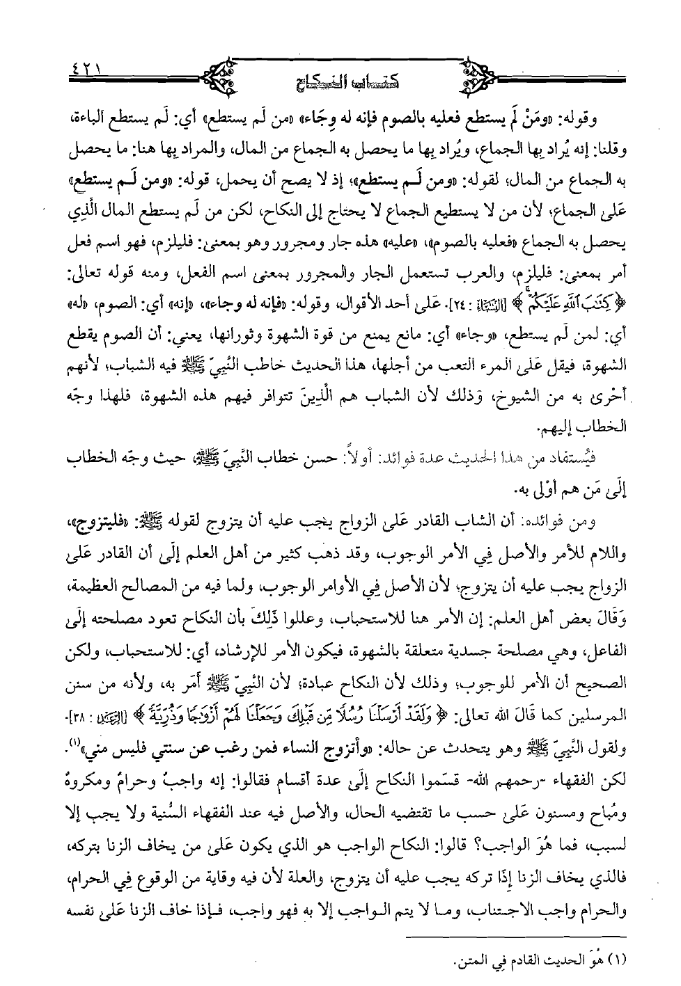 وقلنا: إنه يُراد بها الجماع، ويُراد بها ما يحصل به الجماع من المال، والمراد بها هنا: ما يحصل به الجماع من المال؛ لقوله: «من لم يستطع»؛ إذ لا يصح أن يحمل، قوله: «من لم يستطع» على الجماع، لأن من لا يستطيع الجماع لا يحتاج إلى النكاح، لكن من لم يستطع المال الذي يحصل به الجماع «فعليه بالصوم»، «عليه» هذه جار ومجرور وهو بمعنى: فليلزم، فهو اسم فعل أمر بمعنى: فليلزم، والعرب تستعمل الجار والمجرور بمعنى اسم الفعل، ومنه قوله تعالى: {كِتَابَ اللَّهِ عَلَيْكُمْ} [النساء: 24] وقوله: «فإنه له وجاء»، «إنه» أي: الصوم، «له» أي: لمن لم يستطع، «وجاء» أي: مانع يمنع من قوة الشهوة وثورانها، يعني: أن الصوم يقطع الشهوة، فيقل على المرء التعب من أجلها، هذا الحديث خاطب النيي (صلى الله عليه وسلم) فيه الشباب؛ لأنهم أخرى به من الشيوخ، وذلك لأن الشباب هم الذين تتوافر فيهم هذه الشهوة، فلهذا وجّه الخطاب إليهم.
