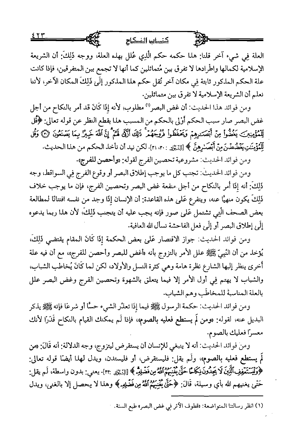 ومن فوائد هذا الحديث: أن غض البصر مطلوب؛ لأنه إذا كان قد أمر بالنكاح من أجل غض البصر صار سبب الحكم أولى بالحكم من المسبب هذا بقطع النظر عن قوله تعالى: {قُل لِّلْمُؤْمِنِينَ يَغُضُّوا مِنْ أَبْصَارِهِمْ وَيَحْفَظُوا فُرُوجَهُمْ ذَلِكَ أَزْكَى لَهُمْ إِنَّ اللَّهَ خَبِيرٌ بِمَا يَصْنَعُونَ (30) وَقُل لِّلْمُؤْمِنَاتِ يَغْضُضْنَ مِنْ أَبْصَارِهِنَّ} [النور: 30، 31] لكن نيد أن نأخذ الحكم من هذا الحديث.