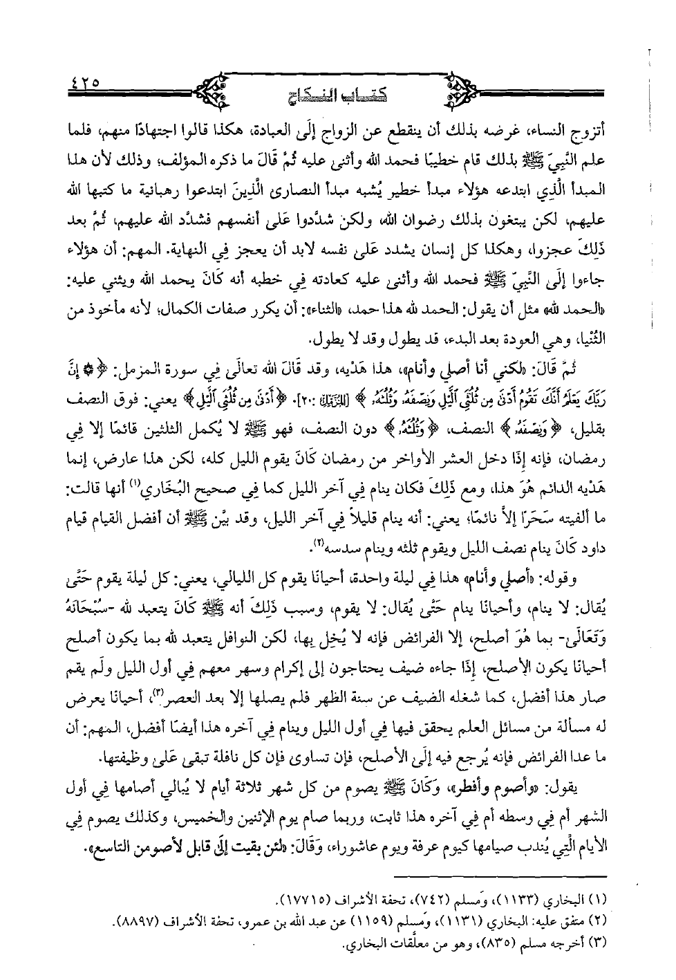 ثمّ قال: «لكني أنا أصلي وأنام»، هذا هديه، وقد قال الله تعالى في سورة المزمل: {إِنَّ رَبَّكَ يَعْلَمُ أَنَّكَ تَقُومُ أَدْنَى مِن ثُلُثَيِ اللَّيْلِ وَنِصْفَهُ وَثُلُثَهُ} [المزمل: 20]. {أَدْنَى مِن ثُلُثَيِ اللَّيْلِ} يعني: فوق النصف بقليل، {وَنِصْفَهُ} النصف {وَثُلُثَهُ} دون النصف، فهو (صلى الله عليه وسلم) لا يُكمل الثلثين قائمًا إلا في رمضان، فإنه إذا دخل العشر الأواخر من رمضان كان يقوم الليل كله، لكن هذا عارض، إنما هديه الدائم هو هذا، ومع ذلك فكان ينام في آخر الليل كما في صحيح البخاري أنها قالت: ما ألفيته سَحَراً إلا نائمًا؛ يعني: أنه ينام قليلاً في آخر الليل، وقد بين (صلى الله عليه وسلم) أن أفضل القيام قيام داود كان ينام نصف الليل ويقوم ثلثه وينام سدسه.