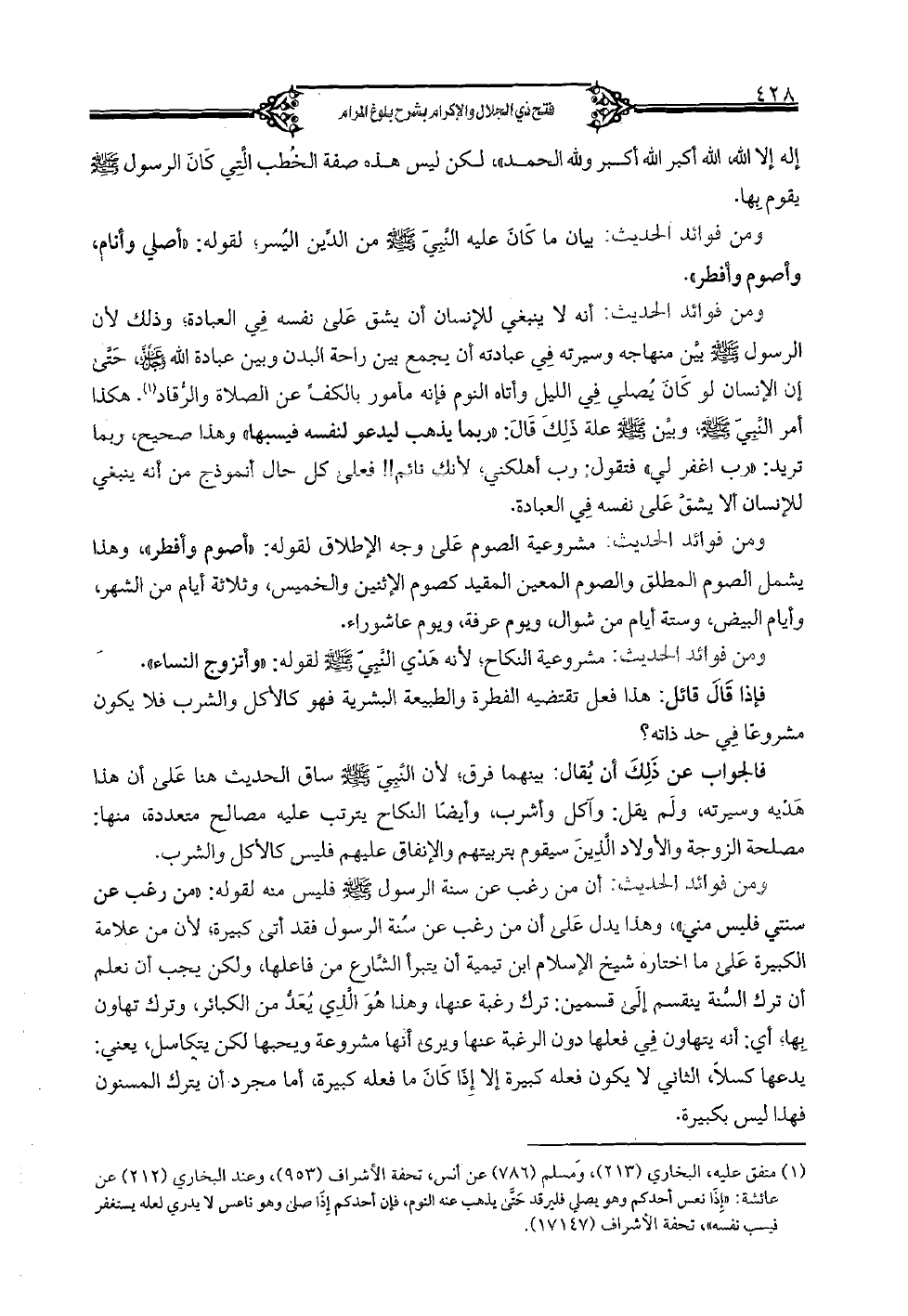 إله إلا الله، الله أكبر الله أكبر ولله الحمد»، لكن ليس هذه صفة الخطب التي كان الرسول (صلى الله عليه وسلم) يقوم بها. ومن فوائد الحديث: بيان ما كان عليه النبي (صلى الله عليه وسلم) من الدين اليُسر لقوله: «أصلي وأنام، وأصوم وأفطر».