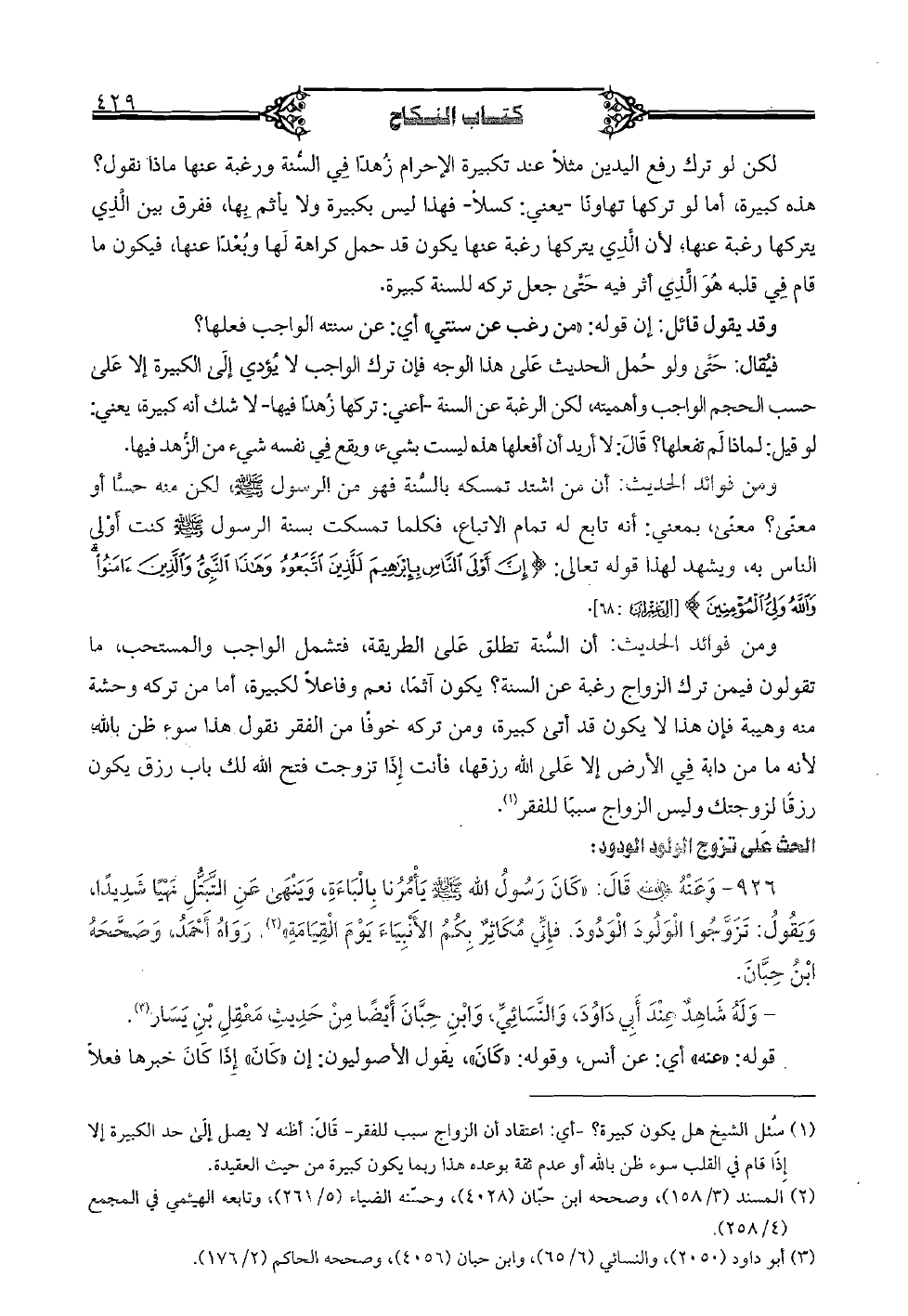 ومن فوائد الحديث: أن السنة تطلق على الطريقة، فتشمل الواجب والمستحب، ما تقولون فيمن ترك الزواج رغبة عن السنة؟ يكون آثمًا، نعم وفاعلاً لكبيرة، أما من تركه وحشة منه وهيبة فإن هذا لا يكون قد أتى كبيرة، ومن تركه خوفا من الفقر نقول هذا سوء ظن بالله؛ لأنه ما من دابة في الأرض إلا على الله رزقها، فأنت إذا تزوجت فتح الله لك باب رزق يكون رزقا لزوجتك وليس الزواج سببًا للفقر.
