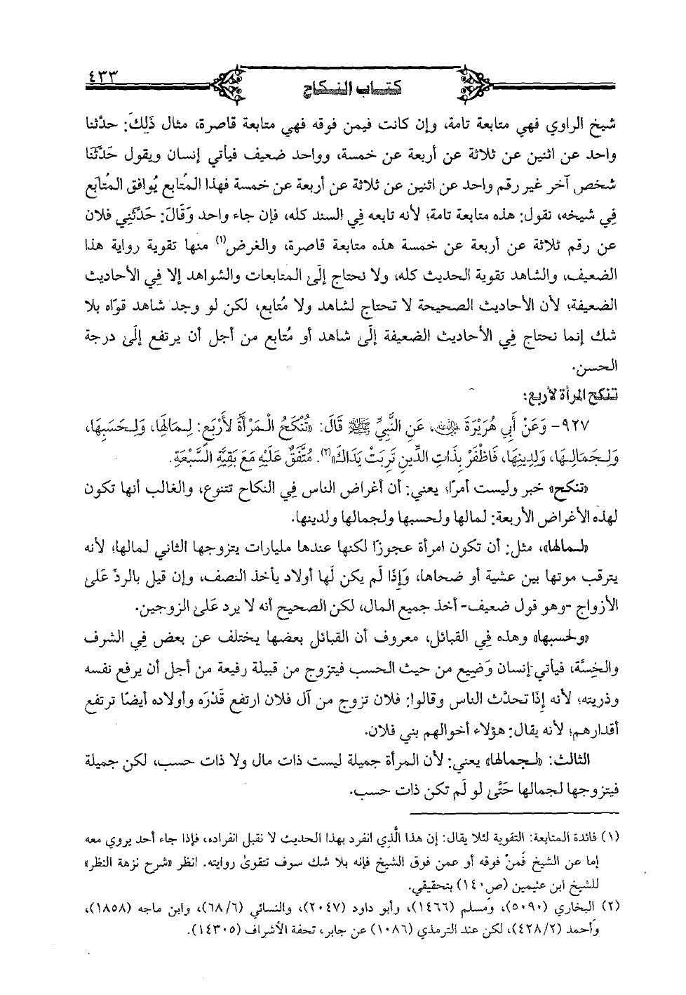 (927) - وَعَنْ أَبِي هُرَيْرَةً (رضي الله عنه)، عن النبي (صلى الله عليه وسلم) قَالَ: «تُنكَحُ الْمَرْأةً لأربعة: لمَالهَا، وَلحَسُبها،