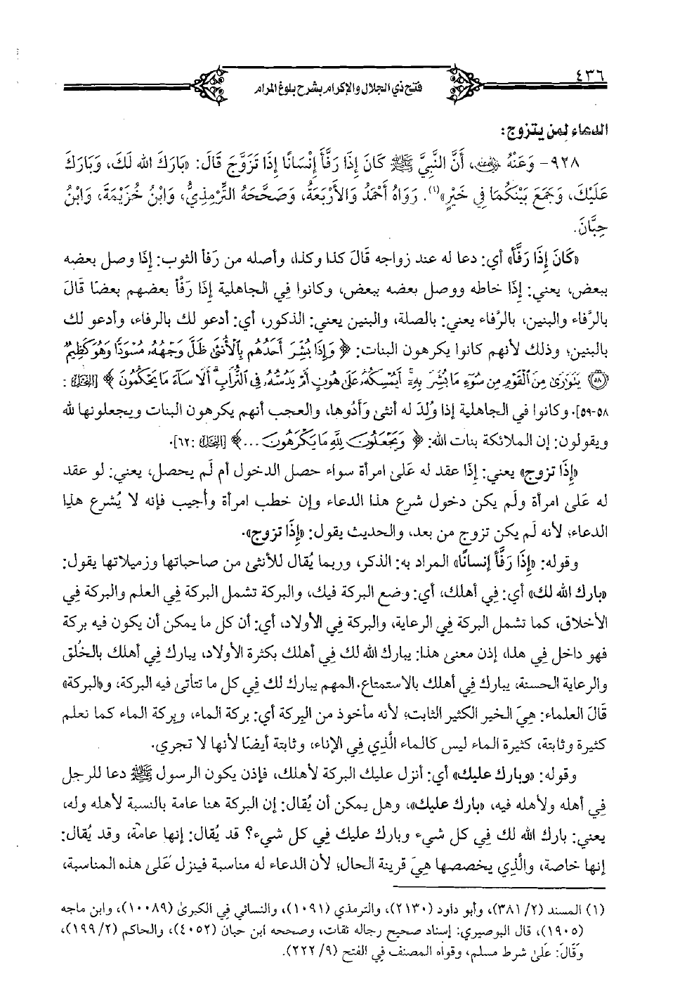 928 - وعنه (رضي الله عنه)، أن النبي (صلى الله عليه وسلم) كان إذا رفأ إنسانًا إذا تزوج قال: «بارك الله لك، وبارك عليك، وجمع بينكما في خير». رواه أحمد والأربعة، وصححه الترمذي، وابن خزيمة، وابن حبان.