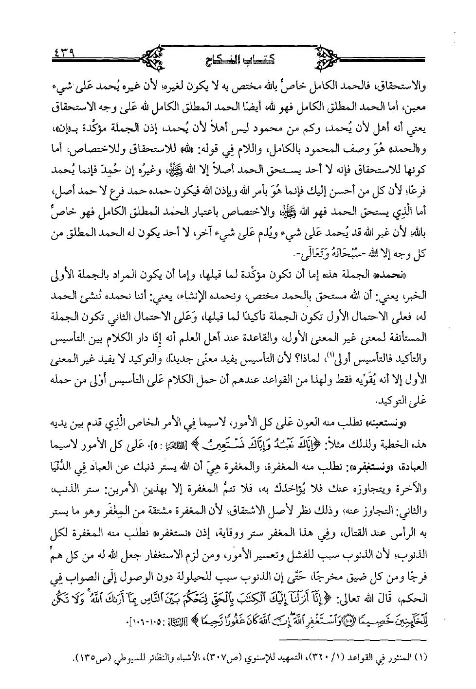 «نحمده» الجملة هذه إما أن تكون مؤكدة لما قبلها، وإما أن يكون المراد بالجملة الأولى الخبر، يعني: أن الله مستحق بالحمد مختص، ونحمده الإنشاء، يعني: أننا نحمده تُنشى الحمد له، فعلى الاحتمال الأول تكون الجملة تأكيدا لما قبلها، وَعَلى الاحتمال الثاني تكون الجملة المستأنفة لمعنى غير المعنى الأول، والقاعدة عند أهل العلم أنه إذا دار الكلام بين التأسيس والتأكيد فالتأسيس أولى، لماذا؟ لأن التأسيس يفيد معنى جديدًا، والتوكيد لا يفيد غير المعنى الأول إلا أنه يقويه فقط ولهذا من القواعد عندهم أن حمل الكلام على التأسيس أولى من حمله على التوكيد.