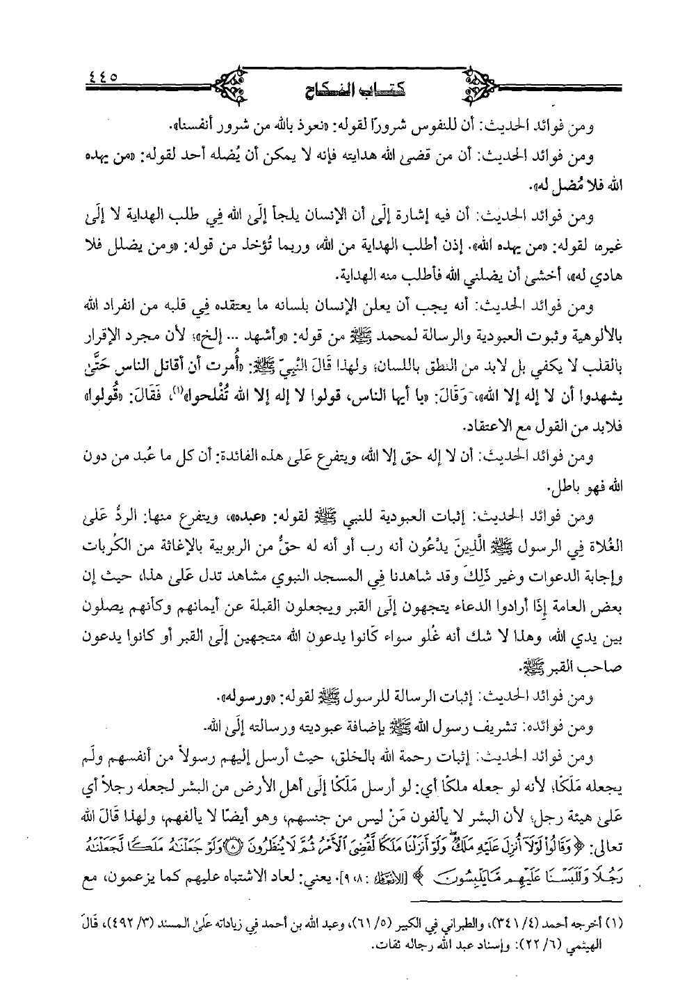 ومن فوائد الحديث: أنه يجب أن يعلن الإنسان بلسانه ما يعتقده في قلبه من انفراد الله بالألوهية وثبوت العبودية والرسالة لمحمد (صلى الله عليه وسلم) من قوله: «وأشهد ... إلخ»؛ لأن مجرد الإقرار بالقلب لا يكفى بل لابد من النطق باللسان، ولهذا قال النبي (صلى الله عليه وسلم): «أُمرت أن أقاتل الناس حَتَّى يشهدوا أن لا إله إلا الله»، وقال: «يا أيها الناس، قولوا لا إله إلا الله تفلحوا» فقال: «قولوا» فلابد من القول مع الاعتقاد.