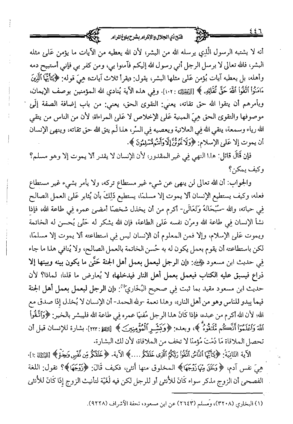 والجواب: أن الله تعالى لن ينهى عن شيء غير مستطاع تركه، ولا يأمر بشيء غير مستطاع فعله، وكيف يستطيع الإنسان ألا يموت إلا مسلمًا، يستطيع ذلك بأن يثابر على العمل الصالح في حياته، والله -سبْحَانه وتعالى- أكرم من أن يخذل شخصا أمضى عمره في طاعة الله، فإذا نشأ الإنسان في طاعة الله ومرن نفسه على الطاعة، فإن الله يشكر له حتّى يُحسن له الخاتمة ويموت على الإسلام، وإلا فمن المعلوم أن الإنسان ليس في استطاعته ألا يموت إلا مسلمًا، لكن باستطاعته أن يقوم بعمل يكون له به خسن الخاتمة بالعمل الصالح، ولا يُنافي هذا ما جاء في حديث ابن مسعود (رضي الله عنه): «إن الرجل ليعمل بعمل أهل الجنة حَتَّى ما يكون بينه وبينها إلا ذراع فيسبق عليه الكتاب فيعمل بعمل أهل النار فيدخلها»، لا يُعارض ما قلنا؛ لماذا؟ لأن حديث ابن مسعود مقيد بما ثبت في صحيح البخاري: «إن الرجل ليعمل بعمل أهل الجنة فيما يبدو للناس وهو من أهل النار»، وهذا نعمة -ولله الحمد- أن الإنسان لا يُخذل إذا صدق مع الله لأن الله أكرم من عبده، فإذا كان هذا الرجل مُفنيًا عمره في طاعة الله فليبشر بالخير: {وَاتَّقُوا اللَّهَ وَاعْلَمُوا أَنَّكُمْ مُلَاقُوهُ}، وبعده {وَبَشِّرِ الْمُؤْمِنِينَ} [البقرة: 223]. بشارة للإنسان قبل أن تحصل الملاقاة ما دمت مؤمنًا لا تخف من الملاقاة؛ لأن لك البشارة.
