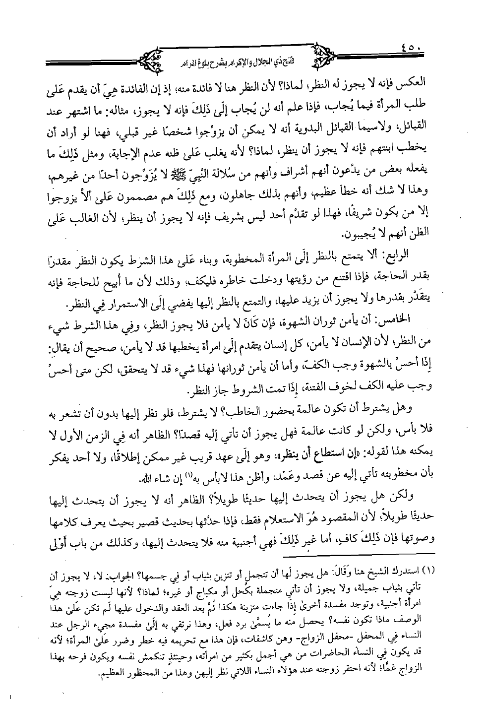 الخامس: أن أمن ثوران الشهوة، فإن كان لا يأمن فلا يجوز النظر، وفي هذا الشرط شيء من النظر؛ لان الإنسان لا يأمن كل إنسان يتقدم إلى امرأة يخطبها قد لا يأمن، صحيح أن يقال: إذا أحس بالشهوة وجب الكف وأما أن يأمن ثورانها فهذا شيء قد لا يتحقق، لكن متى أحس وجب عليه الكف لخوف الفتنة، إذا تمت الشروط جاز النظر.