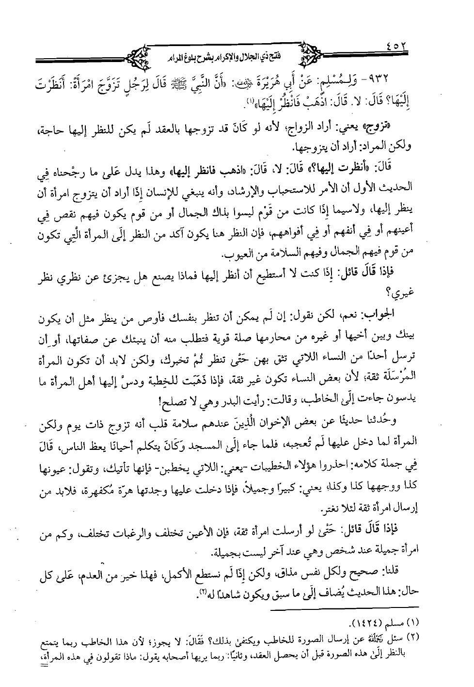 (932) - وَلِمُسلم: عَنْ أَي هُرَيْرَةً (رضي الله عنه): أنّ النبيّ (صلى الله عليه وسلم) قَالَ لِرَجُل تَرَوّجَ امْرَأة: أنظرت