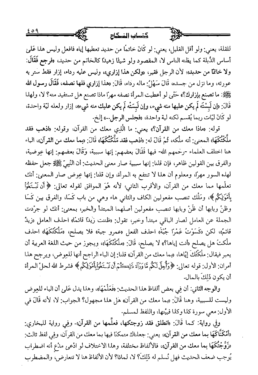 قوله: «ماذا معك من القرآن؟ » يعني: ما الذي معك من القرآن، وقوله: «اذهب فقد ملكتكها»، المعنى: انه ملكه ثم قال له: «اذهب فقد ملكتكها»، قال: «بما معك من القرآن»، الباء هنا اختلف العلماء -رحمهم الله- فيها فقال بعضهم: إنها سببية، وقال بعضهم: إنها عِوضية، والفرق بين القولين ظاهر، فإن قلنا: إنها سببية صار معنى الحديث: أن النبي (صلى الله عليه وسلم) جعل حفظه لهذه السور مهرا، ومعلوم أن هذا لا تنتفع به المرأة، وإن قلنا: إنها عوض صار المعنى: أنك تعلمها مما معك من القرآن، والأقرب الثاني، لأنه هُوَ الموافق لقوله تعالى: {أن تبّتغُوا بأمَولِكُم} [النساء: 24]، وملك تنصب مفعولين الكاف والثاني هاء وهي من باب كسا، والفرق بين كسا وظن وبابها أن ظن وبابها تنصب مفعولين أصلهما المبتدأ والخبر، بمعنى: أنك لو جردت الجملة عن العامل لصار الباقي مبتدأ وخبر، تقول: «ظننت زيدا قائمًا» احذف العامل «زيد قائم»، لكن «كسوت عَمْراً جُبّة»، احذف الفعل «عمرو جبة»، فلا يصلح، «ملكتكها» احذف ملكت هل يصلح «أنت إياها؟ »، لا يصلح، قال: «ملكُتُكها»، ويجوز من حيث اللغة العربية أن يعبر فيقال: ملكتك إيّاها، «بما معك من القرآن» قلنا: إن الباء الراجح أنها للعوض، ويرجح هذا أمران: الأول: قوله تعالى: {وَأُحِلَّ لَكُمْ مَا وَرَاءَ ذَلِكُمْ أَنْ تَبْتَغُوا} [النساء: 24] فشرط الله لحل المرأة أن يكون ذلك بالمال.