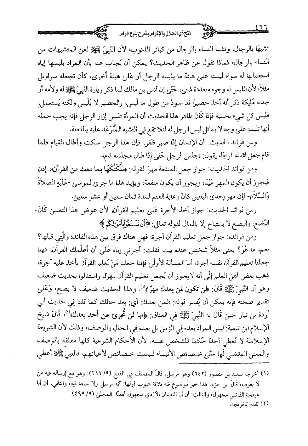 ومن فوائده: جواز جعل تعليم القرآن أجرة، فهل هناك فرق بين هذه الفائدة والتي قبلها؟ نعم، ما هو؟ يعني مثلاً شخص عنده بيت فقلت: أجرني إياه على أن أعلمك القرآن، فهنا جعلنا تعليم القرآن نفسه أجرة أما المسألة الأولى فإننا جعلنا مَن يُعلم القرآن يأخذ عليه أجرة، ذهب بعض أهل العلم إلى أنه لا يجوز أن يُجعل تعليم القرآن مهرا، واستدلوا بحديث ضعيف وهو أن النبي (صلى الله عليه وسلم) قال: «لن تكون لمن بعدك مهرًا». وهذا الحديث ضعيف لا يصح، وعلى تقدير صحته فإنه يمكن أن يُفسر قوله: «لمن بعدك» أي: بعد حالك كما قلنا في حديث أبي بردة بن نيار حين قال له النبي (صلى الله عليه وسلم) في العناق: «إنها لن تجزى عن أحد بعدك»، قال شيخ الإسلام ابن تيمية ليس المراد بعده في الزمن بل بعده في الحال والوصف؛ وذلك لأن الشريعة الإسلامية لا تُعطي أحدًا حُكما للشخص نفسه، لأن الأحكام الشرعية كلها معلقة بالوصف والمعنى المقضي لها حتى خصائص الأنبياء ليست خصائص لأعيانهم، فالنبي (صلى الله عليه وسلم) أعطي