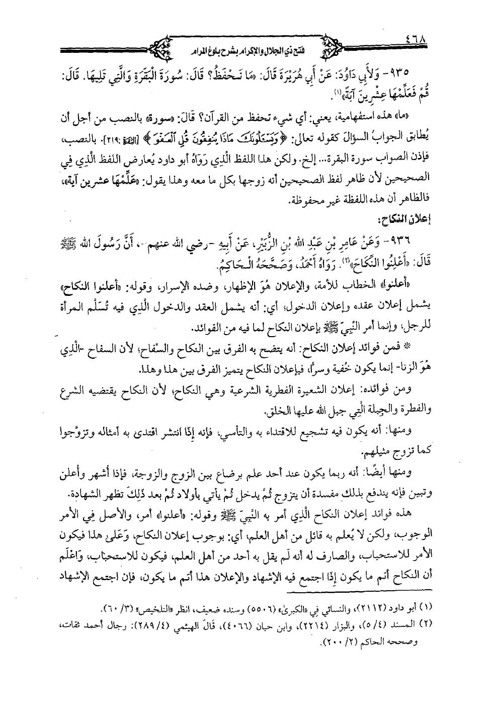 936 - وعن عامر بن عبد الله بن الزبير، عن أبيه (رضي الله عنهم)، أن رسول الله (صلى الله عليه وسلم) قال: «أعلنوا النكاح». رواه أحمد، وصححه الحاكم.
