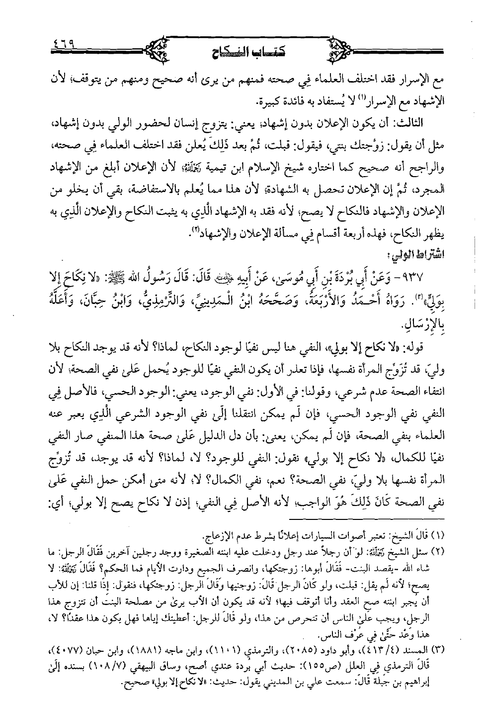 937 - وعن أبي بردة بن أبي موسى، عن أبيه (رضي الله عنه) قال: قال رسول الله (صلى الله عليه وسلم): «لا نكاح إلا بولي». رواه أحمد والأربعة، صححه ابن المديني، والترمذي، وابن حِبان، وأعله بالإرسال.