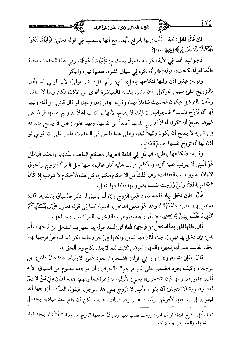 وقوله: «بغير إذن وليها فنكاحها باطل»، أي: ولم يقل: بغير بوليّ؛ لأن الولي قد يأذن بالتزويج على سبيل التوكيل، فإن باشره بنفسه فالمباشرة أقوى من الإذن، لكن ربما لا يباشر ويأذن بالتوكيل فيكون الحديث شاملاً لهذا، وقوله: «بغير إذن وليها»، لو قال قائل: لو أذن وليها لها أن تُزّوج نفسها؟ فالجواب: أن ذلك لا يصح، لأنها لو كانت أهلاً لتزويج نفسها فرعًا عن غيرها لصح أن تكون أهلاً لتزويج نفسها أصلاً من نفسها، ولهذا نقول: «من لا يصح تصرفه في شيء لا يصح أن يكون وكيلاً فيه»، وعلى هذا فليس في الحديث دليل على أن الولي لو أذن لها أن تزوج نفسها لصح النكاح.