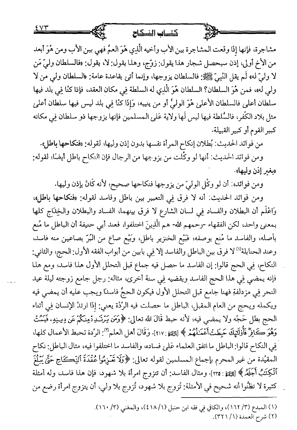 ومن فوائده: أن لو وكل الولي من يزوجها فنكاحها صحيح، لأنه كان بإذن وليها. ومن فوائد الحديث: أنه لا فرق في التعبير بين باطل وفاسد لقوله: «فنكاحها باطل»، واعلم أن البطلان والفساد في لسان الشارع لا فرق بينهما، الفساد والبطلان والخدّاج كلها بمعنى واحد، لكن الفقهاء -رحمهم الله- هم الذين اختلفوا، فعند أبي حنيفة أن الباطل ما مُنع بأصله، والفاسد ما مُنع بوصفه؛ فبيع الخنزير باطل، وبيع صاع من البر بصاعين منه فاسد، وعند الحنابلة لا فرق بين الباطل والفاسد إلا في بابين من أبواب الفقه الأول: الحج، والثاني: النكاح، في الحج قالوا: إن الفاسد ما حصل فيه جماع قبل التحلل الأول هذا فاسد، ومع هذا فإنه يمضي في هذا الحج الفاسد ويقضيه في سنة أخرى، مثاله: رجل جامع زوجته ليلة عيد النحر في مزدلفة فهنا جامع قبل التحلل الأول فيكون الحج فاسدًا ويجب عليه أن يمضي فيه ويكمله ويحج من العام المقبل، الباطل ما حصلت فيه الردّة يعني: إذا ارتدّ الإنسان في أثناء الحج بطل حَجَّه ولا يمضي فيه، لأنه حبط قال الله تعالى: {وَمَنْ يَرْتَدِدْ مِنْكُمْ عَنْ دِينِهِ فَيَمُتْ وَهُوَ كَافِرٌ فَأُولَئِكَ حَبِطَتْ أَعْمَالُهُمْ} [البقرة: 217]. وقال أهل العلم: الردة تحبط الأعمال كلها، في النكاح قالوا: الباطل ما اتفق العلماء على فساده، والفاسد ما اختلفوا فيه، مثال الباطل: نكاح المقيدة من غير المحرم بإجماع المسلمين لقوله تعالى: {وَلَا تَعْزِمُوا عُقْدَةَ النِّكَاحِ حَتَّى يَبْلُغَ الْكِتَابُ أَجَلَهُ} [البقرة: 235]. ومثال الفاسد: أن تتزوج امرأة بلا شهود، فإن هذا فاسد، وله أمثلة كثيرة لا تظنوا أنه شحيح في الأمثلة: تُزوج بلا شهود، تُزوج بلا ولي، أن يتزوج امرأة رضع من