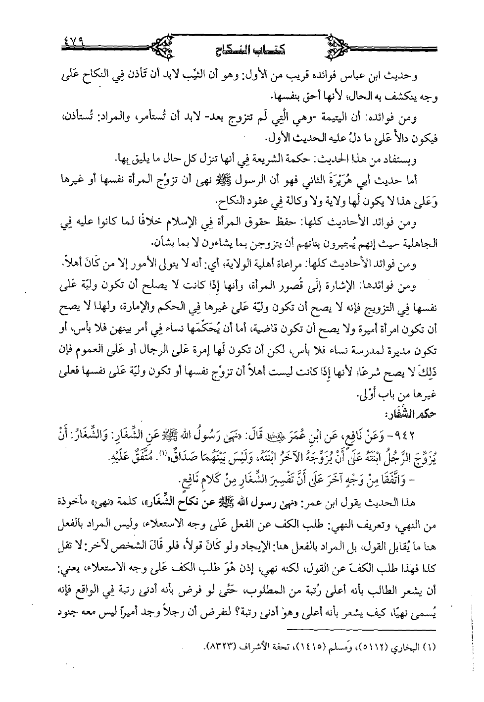 942 - وعن نافع، عن ابن عمر (رضي الله عنهما قال: «نهى رسول الله (صلى الله عليه وسلم) عن الشغار: والشغار: أ، يزوج ابنته على أن يزوجه الآخر ابنته، وليس بينهما صداق». متفق عليه.