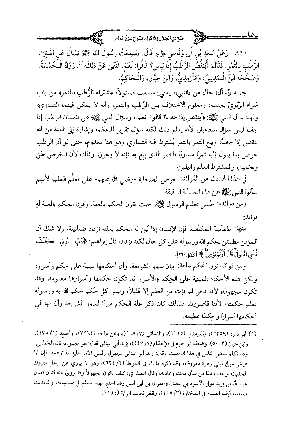 810 - وعن سعد بن أبي وقاص رضي الله عنه قال: «سمعت رسول الله صلى الله عليه وسلم يسأل عن اشتراء الرطب بالتمر. فقال: أينقص الرطب إذا يبس؟ قالوا: نعم. فنهى عن ذلك». رواه الخمسة، وصححه ابن المديني، والترمذي، وابن حبان، والحاكم.