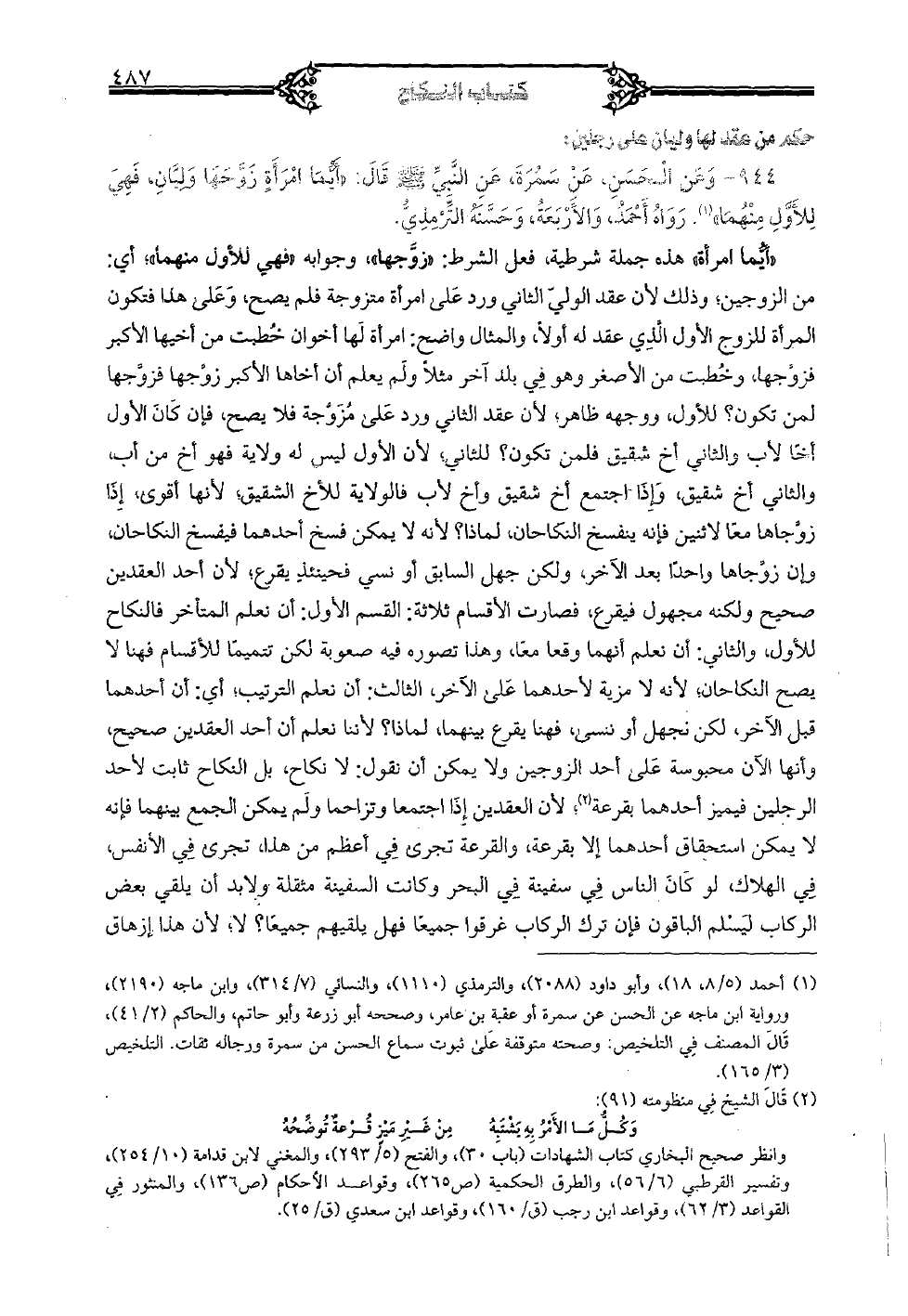 «أيُما امرأة»، هذه جملة شرطية، فعل الشرط: «زوجها»، وجوابه «فهي للأول منهما»؛ أي: من الزوجين؛ وذلك لأن عقد الولي الثاني ورد على امرأة متزوجة فلم يصح، وعلى هذا فتكون المرأة للزوج الأول الذي عقد له أولاً، والمثال واضح: امرأة لها أخوان خُطبت من أخيها الأكبر فزوجها، وخطبت من الأصغر وهو في بلد آخر مثلاً ولم يعلم أن أخاها الأكبر زوجها فزوّجها لمن تكون؟ للأول، ووجهه ظاهر، لأن عقد الثاني ورد على مزوجة فلا يصح، فإن كان الأول أخا لأب والثاني أخ شقيق فلمن تكون؟ للثاني، لأن الأول ليس له ولاية فهو أخ من أب، والثاني أخ شقيق، وإذا اجتمع أخ شقيق وأخ لأب فالولاية للأخ الشقيق؛ لأنها أقوى، إذا زوجاها معا لاثنين فإنه ينفسخ النكاحان، لماذا؟ لأنه لا يمكن فسخ أحدهما فيفسخ النكاحان، وإن زوّجاها واحدًا بعد الآخر، ولكن جهل السابق أو نسي فحينئذ يقرع؛ لأن أحد العقدين صحيح ولكنه مجهول فيقرع، فصارت الأقسام ثلاثة: القسم الأول: أن نعلم المتأخر فالنكاح للأول، والثاني: أن نعلم أنهما وقعا معا، وهذأ تصوره فيه صعوبة لكن تتميمًا للأقسام فهنا لا يصح النكاحان؛ لأنه لا مزية لأحدهما على الآخر، الثالث: أن نعلم الترتيب؛ أي: أن أحدهما قبل الآخر، لكن نجهل أو ننسى، فهنا يقرع بينهما، لماذا؟ لأننا نعلم أن أحد العقدين صحيح، وأنها الآن محبوسة على أحد الزوجين ولا يمكن أن نقول: لا نكاح، بل النكاح ثابت لأحد الرجلين فيميز أحدهما بقرعة؛ لأن العقدين إذا اجتمعا وتزاحما ولم يمكن الجمع بينهما فإنه لا يمكن استحقاق أحدهما إلا بقرعة، والقرعة تجرى في أعظم من هذا، تجرى في الأنفس، في الهلاك، لو كان الناس في سفينة في البحر وكانت السفينة مثقلة ولابد أن يلقي بعض الركاب ليسلم الباقون فإن ترك الركاب غرقوا جميعًا فهل يلقيهم جميعًا؟ لا، لأن هذا إزهاق