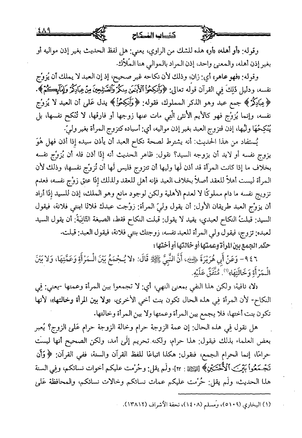 946 - وعن أبي هريرة (رضي الله عنه)، أن النبي (صلى الله عليه وسلم) قال: «لا يجمع بين المرأة وعمتها، ولا بين المرأة وخالتها». متفق عليه.
