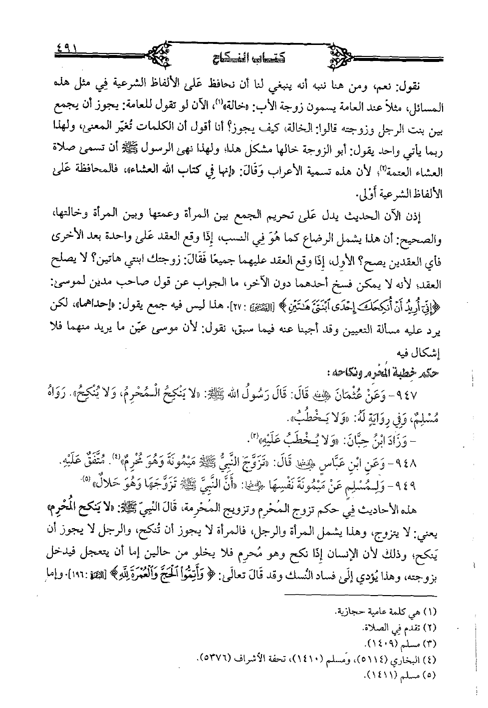 إذن الآن الحديث يدل على تحريم الجمع بين المرأة وعمتها وبين المرأة وخالتها، والصحيح: أن هذا يشمل الرضاع كما هو في النسب، إذا وقع العقد على واحدة بعد الأخرى فأي العقدين يصح؟ الأول، إذا وقع العقد عليهما جميعًا فقال: زوجتك ابنتي هاتين؟ لا يصلح العقد، لأنه لا يمكن فسخ أحدهما دون الآخر، ما الجواب عن قول صاحب مدين لموسى: {إِنِّي أُرِيدُ أَنْ أُنكِحَكَ إِحْدَى ابْنَتَيَّ هَاتَيْنِ} [القصص: 27]. هذا ليس فيه جمع يقول: «إحداهما»، لكن يرد عليه مسألة التعيين وقد أجبنا عنه فيما سبق، نقول: لأن موسى عين ما يريد منهما فلا إشكال فيه.