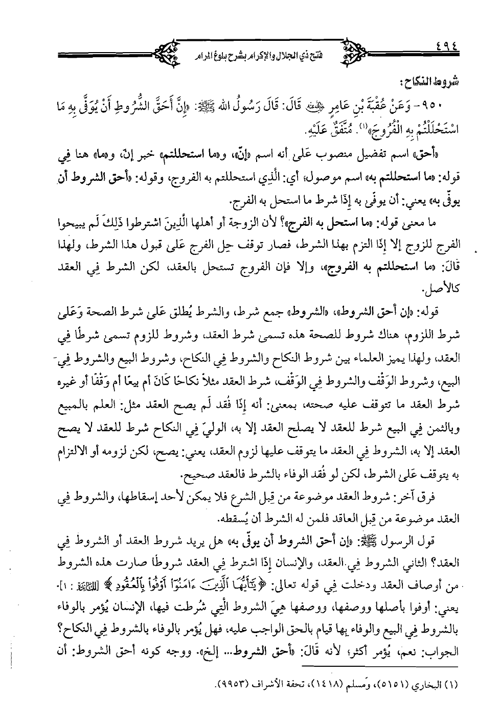 950 - وعن عقبة بن عامر (رضي الله عنه قال: قال رسول الله (صلى الله عليه وسلم): «إن أحق الشروط أن يوفى به ما استحللتم به الفروج». متفق عليه.