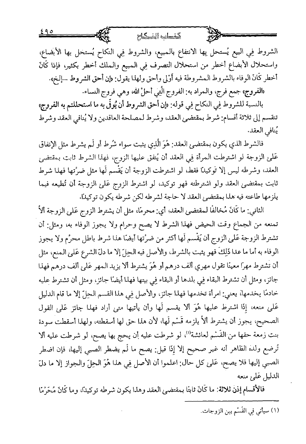 الثاني: ما كان مُخالفا لمقتضى العقد، أي: محرمًا، مثل أن يشترط الزوج على الزوجة ألا تمنعه من الجماع وقت الحيض فهذا الشرط لا يصح وحرام ولا يجوز الوفاء به، ومثل: أن تشترط الزوجة على الزوج أن يقسم لها أكثر من ضرتها أيضا هذا شرط باطل محرّم ولا يجوز الوفاء به أما ما عدا ذلك فهو يثبت بالشرط، والأصل فيه الحل إلا ما دل الشرع على المنع، مثل أن تشترط مهرا معينا تقول مهري ألف درهم أو هو يشترط ألا يزيد المهر على ألف درهم فهذا جائز، ومثل أن تشترط البقاء في بلدها أو البقاء في بيتها فهذا أيضا جائز، ومثل أن تشترط عليه خادمًا يخدمها، يعني: امرأة تخدمها فهذا جائز، والأصل في هذا القسم الحل إلا ما قام الدليل على منعه، إذا اشترط عليها هو ألا يقسم لها وأن يأتيها متى أراد فهذا جائز على القول الصحيح، يجوز أن يشترط ألا يلزمه قسّم لها؛ لأن هذا حق لها أسقطته، ولهذا أسقطت سودة بنت زمعة حقها من القسم لعائشة"، لو شرطت عليه أن يحج بها يصح، لو شرطت عليه ألا تُرضع ولده الظاهر أنه غير صحيح إلا إذا قيل: يصح ما لم يضطر الصبي إليها، فإن اضطر الصبي إليها فلا يصح، على كل حال: اعلموا أن الأصل في هذا هو الجل والجواز إلا ما دل الدليل على منعه