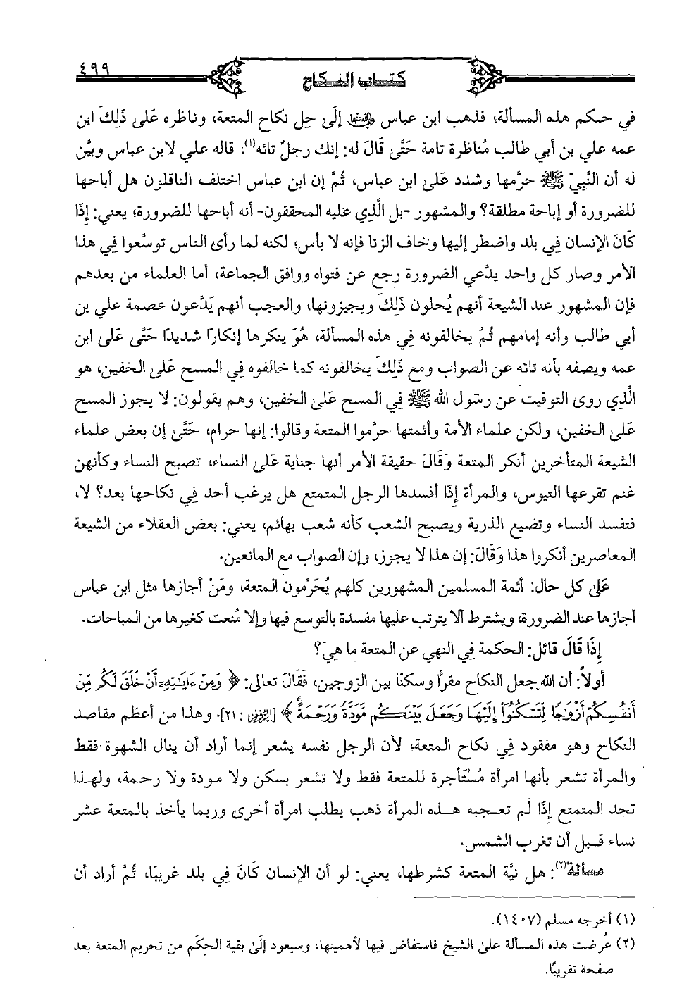 في حكم هذه المسألة، فذهب ابن عباس (رضي الله عنهما) إلى حل نكاح المتعة، وناظره على ذلك ابن عمه علي بن أبي طالب مُناظرة تامة حتى قال له: إنك رجل تائه، قاله علي لابن عباس وبين له أن النبي (صلى الله عليه وسلم) حرمها وشدد على ابن عباس، ثم إن ابن عباس أختلف الناقلون هل أباحها للضرورة أو إباحة مطلقة؟ والمشهور -بل الذي عليه المحققون - أنه أباحها للضرورة؛ يعني: إذا كان الإنسان في بلد واضطر إليها وخاف الزنا فإنه لا بأس، لكنه لما رأى الناس توسعوا في هذا الأمر وصار كل واحد يدّعي الضرورة رجع عن فتواه ووافق الجماعة، أما العلماء من بعدهم فإن المشهور عند الشيعة أنهم يُحلون ذلك ويجيزونها، والعجب أنهم يدّعون عصمة علي بن أبي طالب وأنه إمامهم ثم يخالفونه في هذه المسألة، هو ينكرها إنكارا شديدا حتى على ابن عمه ويصفه بأنه تائه عن الصواب ومع ذلك يخالفونه كما خالفوه في المسح على الخفين، هو الذي روى التوقيت عن رسول الله (صلى الله عليه وسلم) في المسح على الخفين، وهم يقولون: لا يجوز المسح على الخفين، ولكن علماء الأمة وأئمتها حرموا المتعة وقالوا: إنها حرام، حَتَّى إن بعض علماء الشيعة المتأخرين أنكر المتعة وقال حقيقة الأمر أنها جناية على النساء، تصبح النساء وكأنهن غنم تقرعها التيوس، والمرأة إذا أفسدها الرجل المتمتع هل يرغب أحد في نكاحها بعد؟ لا، فتفسد النساء وتضيع الذرية ويصبح الشعب كأنه شعب بهائم، يعني: بعض العقلاء من الشيعة المعاصرين أنكروا هذا وقال: إن هذا لا يجوز، وإن الصواب مع المانعين.