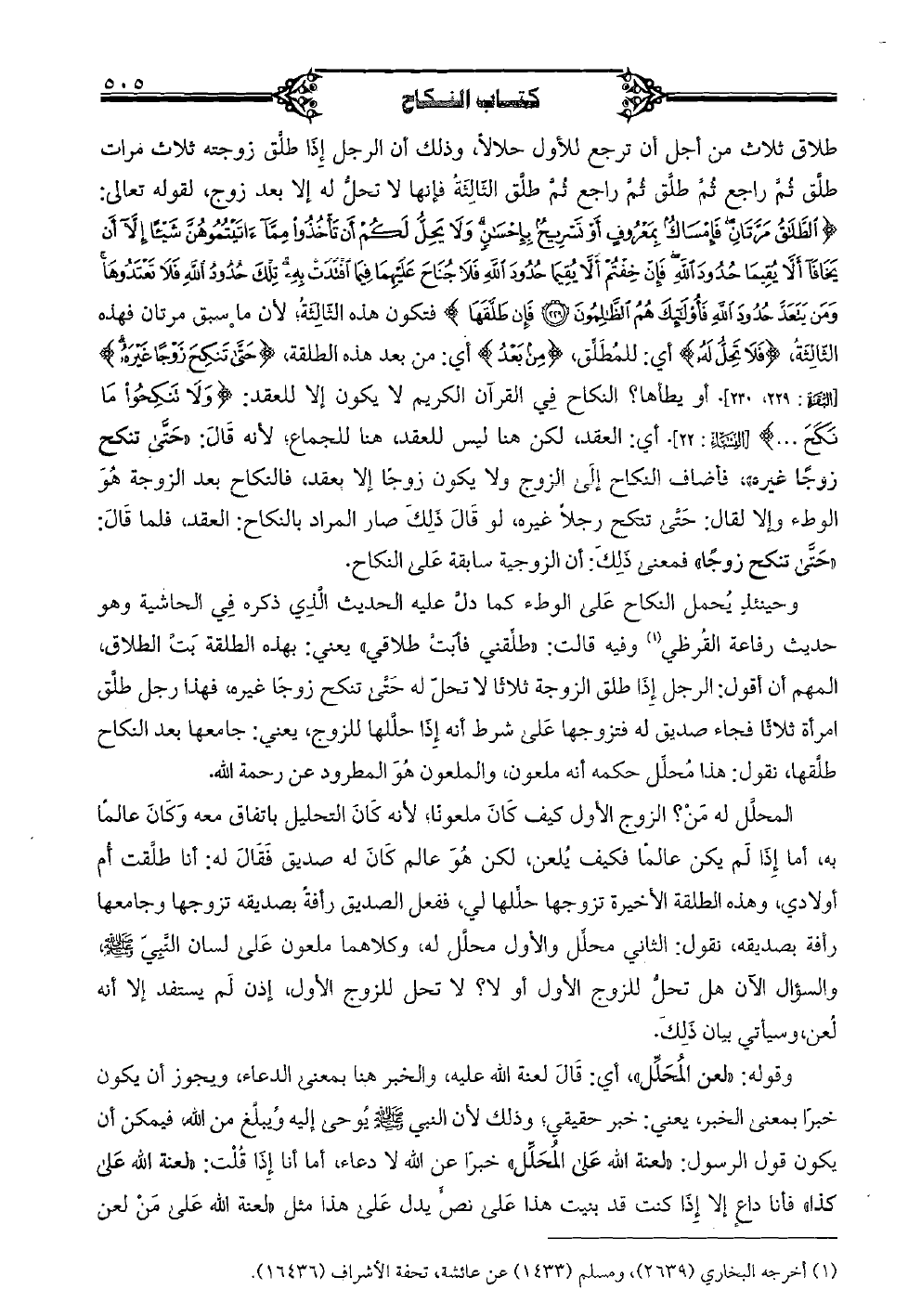 طلاق ثلاث من أجل أن ترجع للأول حلالاً، وذلك أن الرجل إذا طلق زوجته ثلاث مرات طلق ثم ارجع ثم طلق ثم ارجع ثم طلق الثالثة فإنها لا تحل له إلا بعد زوج، لقوله تعالى: {الطَّلَاقُ مَرَّتَانِ فَإِمْسَاكٌ بِمَعْرُوفٍ أَوْ تَسْرِيحٌ بِإِحْسَانٍ وَلَا يَحِلُّ لَكُمْ أَنْ تَأْخُذُوا مِمَّا آتَيْتُمُوهُنَّ شَيْئًا إِلَّا أَنْ يَخَافَا أَلَّا يُقِيمَا حُدُودَ اللَّهِ فَإِنْ خِفْتُمْ أَلَّا يُقِيمَا حُدُودَ اللَّهِ فَلَا جُنَاحَ عَلَيْهِمَا فِيمَا افْتَدَتْ بِهِ تِلْكَ حُدُودُ اللَّهِ فَلَا تَعْتَدُوهَا وَمَنْ يَتَعَدَّ حُدُودَ اللَّهِ فَأُولَئِكَ هُمُ الظَّالِمُونَ (229) فَإِن طَلَّقَهَا} فتكون هذه الثالثة؛ لأن ما سبق مرتان فهذه الثالثة، {فَلَا تَحِلُّ لَهُ} أي: للمطلق، {مِن بَعْدُ} أي: من بعد هذه الطلقة، {حتَّى تَنكِحَ زَوْجًا غَيْرَهُ} [البقرة: 229، 230]. أو يطأها؟ النكاح في القرآن الكريم لا يكون إلا للعقد: {وَلاَ تَنكِحُوا مَا نَكَحَ .... } [النساء: 22]. أي: العقد، لكن هنا ليس للعقد، هنا للجماع؛ لأنه قال: «حتى تنكح زوجاً غيره»، فأضاف النكاح إلى الزوج ولا يكون زوجا إلا بعقد، فالنكاح بعد الزوجة هو الوطء وإلا لقال: حتى تنكح رجلا غيره، لو قال ذلك صار المراد بالنكاح: العقد، فلما قال: «حتى تنكح زوجاً» فمعنى ذلك: أن الزوجية سابقة على النكاح. وحينئذ يحمل النكاح على الوطء كما دل عليه الحديث الذي ذكره في الحاشية وهو حديث رفاعة القرظي وفيه قالت: «طلقني فأبت طلاقي» يعني: بهذه الطلقة بت الطلاق، المهم أن أقول: الرجل إذا طلق الزوجة ثلاثا لا تحل له حتى تنكح زوجاً غيره، فهذا رجل طلق امرأة ثلاثا فجاء صديق له فتزوجها على شرط أنه إذا حللها للزوج، يعني: جامعها بعد النكاح طلقها، نقول: هذا محلل حكمه أنه ملعون، والملعون هو المطرود عن رحمة الله. المحلل له من؟ الزوج الأول كيف كان ملعونا، لأنه كان التحليل باتفاق معه وكان عالما به، أما إذا لم يكن عالما فكيف يلعن، لكن هو عالم كان له صديق فقال له: أنا طلقت أم أولادي، وهذه الطلقة الأخيرة تزوجها حللها لي، ففعل الصديق رأفة بصديقه تزوجها وجامعها رأفة بصديقه، نقول: الثاني محلل والأول محلل له، وكلاهما ملعون على لسان النبي (صلى الله عليه وسلم)، والسؤال الآن هل تحل للزوج الأول أو لا؟ لا تحل للزوج الأول، إذن لم يستفد إلا أنه لعن، وسيأتي بيان ذلك. وقوله: «لعن المحلل» أي: قال لعنة الله عليه، والخبر هنا بمعنى الدعاء، ويجوز أن يكون خبراً بمعنى الخبر، يعني: خبر حقيقي؛ وذلك لأن النبي (صلى الله عليه وسلم) يوحي إليه ويبلغ من الله، فيمكن أن يكون قول الرسول: «لعنة الله على المحلل» خبراً عن الله لا دعاء، أما أنا إذا قلت: «لعنة الله على كذا» فأنا داع إلا إذا كنت قد بنيت هذا على نص يدل على هذا مثل «لعنة الله على من لعن