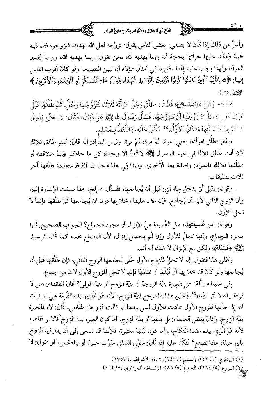 957 - وعن عائشة (رضي الله عنها) قالت: «طلق رجل امرأته ثلاثا، فتزوجها رجل، ثم طلقها قبل أن يدخل بها، فأراد زوجها أن يتزوجها، فسأل رسول الله (صلى الله عليه وسلم) عن ذلك، فقال: لا، حتى يذوق الآخر من عسيلتها ما ذاق الأول». متفق عليه، واللفظ لمسلم. قوله: «طلق امرأته» يعني: مرة، ثم مرة، ثم مرة، وليس المراد: أنه قال: أنت طالق ثلاثا، لأن أنت طالق ثلاثا في عهد الرسول (صلى الله عليه وسلم) لا تعد إلا واحدة، كل ما جاءكم «بت طلاقا» أو «طلقها ثلاثا» فالمراد: واحدة بعد الأخرى، ولهذا في هذا الحديث ألفاظ متعددة طلقها آخر ثلاث تطليقات. وقوله: «قبل أن يدخل بها» أي: قبل أن يجامعها، «فسأل ... » إلخ، هذا سبقت الإشارة إليه، وأن الزوج الثاني لا بد أن يجامع، فإن عقد عليها وخلا بها دون أن يجامعها ثم طلقها فإنها لا تحل للأول. وقوله: «من عُسيلتها»، هل العُسيلة هي الإنزال أو مجرد الجماع؟ الجواب الصحيح: أنها مجرد الجماع، وأنها تحل للأول وإن لم يحصل إنزال، لأن الجماع نفسه كما قال الرسول (صلى الله عليه وسلم): «عُسيلة»، ولكم مع الإنزال لاشك أنه أتم. وعلى هذا فنقول: إنه لا تحل للزوج الأول حتى يجامعها الزوج الثاني، فإن طلقها قبل أن يجامعها ولو كان قد خلا بها أو قبلها أو ضمها فإنها لا تحل للزوج الأول لابد من جماع. بقي علينا مسألة: هل العبرة بنية الزوجة أو بنية الزوج أو بنية الولي؟ قال الفقهاء: «من لا فرقة بيده لا أثر لنيته». وعلى هذا فالمرجع لنية الزوج، لأنه هو الذي بيده الفرقة هي لو نوت أنه إذا حللها للزوج الأول عادت للأول ليس بيدها لو قالت الزوجة: طلقني، قال: لا، فالعبرة بنية الزوج، وقال بعض العلماء: بل بنيتها أو بنية الزوج، أما كون العبرة بنية الزوج فالأمر ظاهر؛ لأنه هو الذي بيده عقدة النكاح، وأما كون نيتها معتبرة؛ فلأنها قد تسعى إلى أن يفارقها الزوج بأي حيلة، ماذا تصنع؟ تنكد عليه إذا قال: سوي الشاي سوت حليباً أو بالعكس، أو تقول: لا