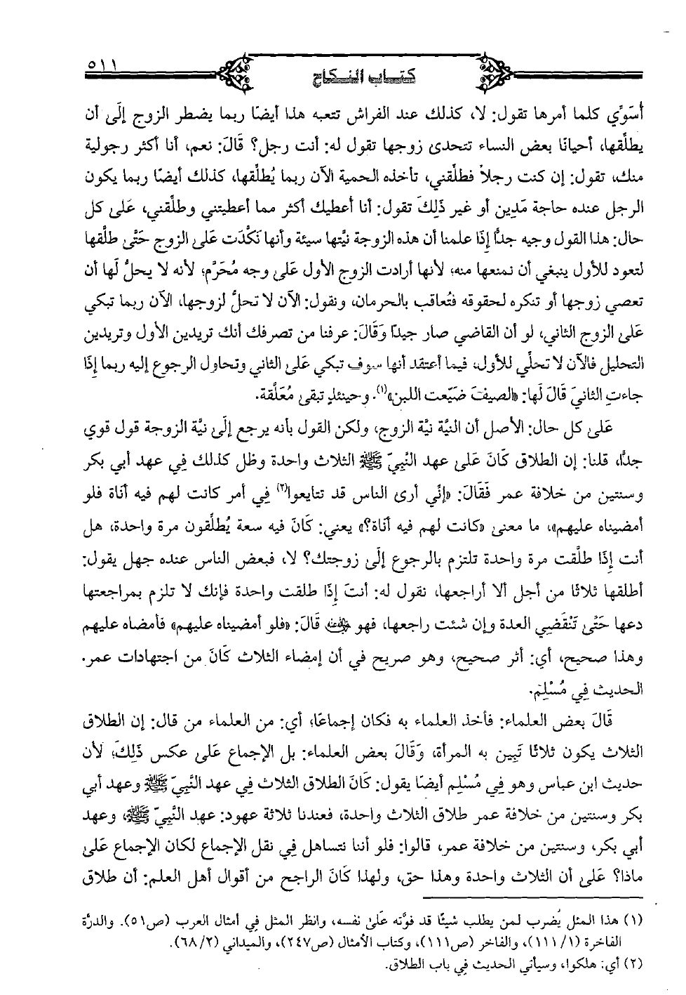 أسوي كلما أمرها تقول: لا، كذلك عند الفراش تتعبه هذا أيضا ربما يضطر الزوج إلى أن يطلقها، أحيانا بعض النساء تتحدى زوجها تقول له: أنت رجل؟ قال: نعم، أنا أكثر رجولية منك، تقول: إن كنت رجلاً فطلقني، تأخذه الحمية الآن ربما يطلقها، كذلك أيضا ربما يكون الرجل عنده حاجة مدين أو غير ذلك تقول: أنا أعطيك أكثر مما أعطيتني وطلقني، على كل حال: هذا القول وجيه جداً إذا علمنا أن هذه الزوجة نيتها سيئة وأنها نكدت على الزوج حتى طلقها لتعود للأول ينبغي أن نمنعها منه؛ لأنها أرادت الزوج الأول على وجه محرم؛ لأنه لا يحل لها أن تعصي زوجها أو تنكره لحقوقه فتعاقب بالحرمان، ونقول: الآن لا تحل لزوجها، الآن ربما تبكي على الزوج الثاني، لو أن القاضي صار جيداً وقال: عرفنا من تصرفك أنك تريدين الأول وتريدين التحليل فالآن لا تحلي للأول، فيما أعتقد أنها سوف تبكي على الثاني وتحاول الرجوع إليه ربما إذا جاءت الثاني قال لها: «الصيف ضيعت اللبن». وحينئذ تبقى معلقة. على كل حال: الأصل أن النية نية الزوج، ولكن القول بأنه يرجع إلى نية الزوجة قول قوي جداً، قلنا: إن الطلاق كان على عهد النبي (صلى الله عليه وسلم) الثلاث واحدة وظل كذلك في عهد أبي بكر وسنتين من خلافة عمر فقال: «إني أرى الناس قد تتايعوا في أمر كانت لهم فيه أناة فلو أمضيناه عليهم»، ما معنى «كانت لهم فيه أناه؟ » يعني: كان فيه سعة يطلقون مرة واحدة، هل أنت إذا طلقت مرة واحدة تلتزم بالرجوع إلى زوجتك؟ لا، فبعض الناس عنده جهل يقول: أطلقها ثلاثا من أجل ألا أراجعها، نقول له: أنت إذا طلقت واحدة فإنك لا تلزم بمراجعتها دعها حتى تنقضي العدة وإن شئت راجعها، فهو (رضي الله عنه) قال: «فلو أمضيناه عليهم» فأمضاه عليهم وهذا صحيح، أي: أثر صحيح، وهو صريح في أن إمضاء الثلاث كان من اجتهادات عمر. الحديث في مسلم. قال بعض العلماء: فأخذ العلماء به فكان إجماعا، أي: من العلماء من قال: إن الطلاق الثلاث يكون ثلاثا تبين به المرأة، وقال بعض العلماء: بل الإجماع على عكس ذلك، لأن حديث ابن عباس وهو في مسلم أيضا يقول: كان الطلاق الثلاث في عهد النبي (صلى الله عليه وسلم) وعهد أبي بكر وسنتين من خلافة عمر طلاق الثلاث واحدة، فعندنا ثلاثة عهود: عهد النبي (صلى الله عليه وسلم)، وعهد أبي بكر، وسنتين من خلافة عمر، قالوا: فلو أننا نتساهل في نقل الإجماع لكان الإجماع على ماذا؟ على أن الثلاث واحدة وهذا حق، ولهذا كان الراجح من أقوال أهل العلم: أن طلاق