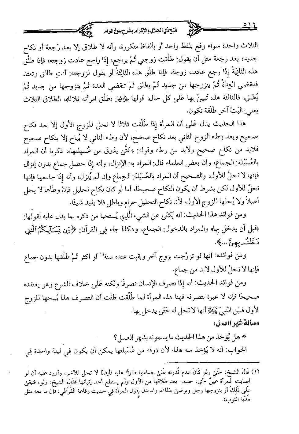 الثلاث واحدة سواء وقع بلفظ واحد أو بألفاظ متكررة، وأنه لا طلاق إلا بعد رجعة أو نكاح جديد، بعد رجعة مثل أن يقول: طلقت زوجتي ثم يراجع، إذا راجع عادت زوجته، فإذا طلق هذه الثانية إذا رجع عادت زوجته، فإذا طلق هذه الثالثة أو يقول لزوجته: أنت طالق وتعتد فتنقضي العدة ثم يتزوجها من جديد ثم يطلق ثم تنقضي العدة ثم يتزوجها من جديد ثم يطلق، فالثالثة هذه تبين بها على كل حال، قولها (رضي الله عنها): «طلق امرأته ثلاثا» الطلاق الثلاث يعني: البت آخر طلقة تكون. هذا الحديث يدل على أن المرأة إذا طلقت ثلاثا لا تحل للزوج الأول إلا بعد النكاح صحيح وبعد وطء الزوج الثاني بعد نكاح صحيح؛ لأن وطء الثاني لا يباح إلا بنكاح صحيح فلابد من نكاح صحيح ولابد من وطء وقوله: «حتى يذوق من عُسيلتها» ذكرنا أن المراد بالعسيلة: الجماع، وأن بعض العلماء قال: المراد به: الإنزال، وأنه إذا حصل جماع بدون إنزال فإنها لا تحل للأول، والصحيح أن المراد بالعسيلة: الجماع وإن لم ينزل، وأنه إذا جامعها فإنها تحل للأول لكن بشرط أن يكون النكاح صحيحا، أما لو كان نكاح تحليل فإن وطأها لا يحل أصلا ولا يحلها للزوج الأول، لأن نكاح التحليل حرام وباطل فلا يفيد شيئا. ومن فوائد هذا الحديث: أنه يكنى عن الشيء الذي يستحيا من ذكره بما يدل عليه لقولها: «قبل أن يدخل بها» والمراد بالدخول: الجماع، وهكذا جاء في القرآن: {مِن نِّسَآئِكُمُ اللاَّتِي دَخَلْتُم بِهِنَّ ... }. ومن فوائده: أنها لو تزوجت بزوج آخر وبقيت عنده سنة أو أكثر ثم طلقها بدون جماع فإنها لا تحل للأول لابد من جماع. ومن فوائد الحديث: أنه إذا تصرف الإنسان تصرفا ولكنه على خلاف الشرع وهو يعتقده صحيحاً فإنه لا عبرة بتصرفه فهنا هذه المرأة لما طلقت ظنت أن التصرف هذا يبيحها للزوج الأول فبين النبي (صلى الله عليه وسلم) أنها لا تحل له حتى يدخل بها.
