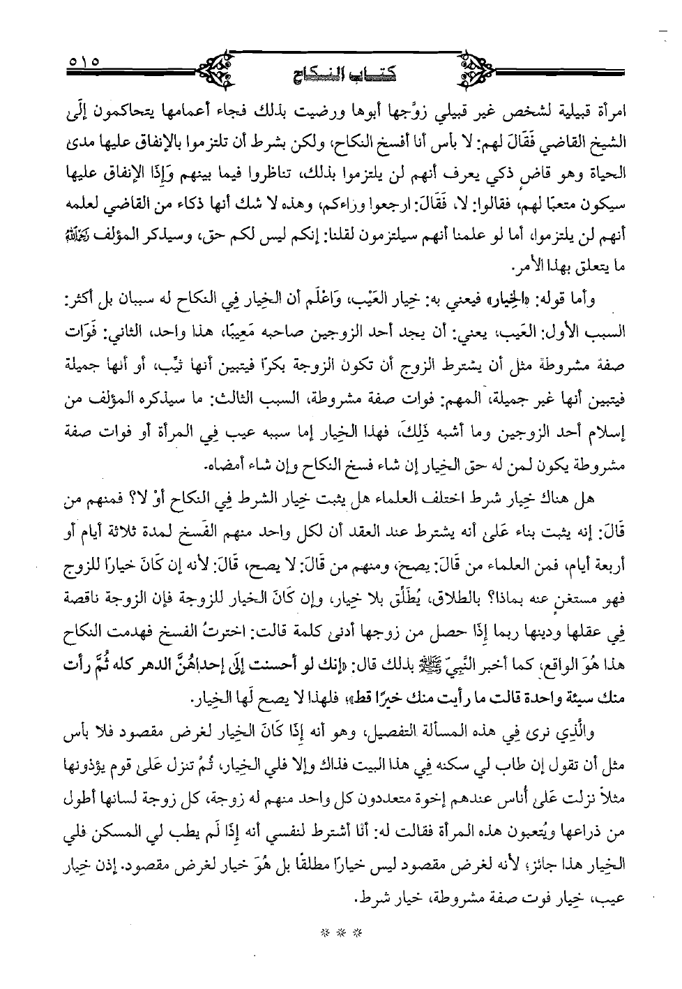 امرأة قبيلية لشخص غير قبيلي زوجها أبوها ورضيت بذلك فجاء أعمامها يتحاكمون إلى الشيخ القاضي فقال لهم: لا بأس أنا أفسخ النكاح، ولكن بشرط أن تلزموا بالإنفاق عليها مدى الحياة وهو قاضٍ ذكي يعرف أنهم لن يلتزموا بذلك، تناظروا فيما بينهم وإذا الإنفاق عليها سيكون متعباً لهم، فقالوا: لا، فقال: ارجعوا وراءكم، وهذه لاشك أنها ذكاء من القاضي لعلمه أنهم لن يلتزموا، أما لو علمنا أنهم سيلتزمون لقلنا: إنكم ليس لكم حق، وسيذكر المؤلف (رحمة الله) ما يتعلق بهذا الأمر. وأما قوله: «الخيار» فيعني به: خيار العيب، وأعلم أن الخيار في النكاح له سببان بل أكثر: السبب الأول: العيب، يعني: أن يجد أحد الزوجين صاحبه معيباً، هذا واحد، الثاني: فوات صفة مشروطة مثل أن يشترط الزوج أن تكون الزوجة بكراً فيتبين أنها ثيب، أو أنها جميلة فيتبين أنها غير جميلة، المهم: فوات صفة مشروطة، السبب الثالث: ما سيذكره المؤلف من إسلام أحد الزوجين وما أشبه ذلك، فهذا الخيار إما سببه عيب في المرأة أو فوات صفة مشروطة يكون لمن له حق الخيار إن شاء فسخ النكاح وإن شاء أمضاه. هل هناك خيار شرط اختلف العلماء هل يثبت خيار الشرط في النكاح أو لا؟ فمنهم من قال: إنه يثبت بناء على أنه يشترط عند العقد أن لكل واحد منهم الفسخ لمدة ثلاثة أيام أو أربعة أيام، فمن العلماء من قال: يصح، ومنهم من قال: لا يصح، قال: لأنه إن كان خياراً للزوج فهو مستغن عنه بماذا؟ بالطلاق، يطلق بلا خيار، وإن كان الخيار للزوجة فإن الزوجة ناقصة في عقلها ودينها ربما إذا حصل من زوجها أدنى كلمة قالت: اخترت الفسخ فهدمت النكاح هذا هو الواقع، كما أخبر النبي (صلى الله عليه وسلم) بذلك قال: «إنك لو أحسنت إلى أحداهن الدهر كله ثم رأت منك سيئة واحدة قالت ما رأيت منك خيراً قط»؛ فلهذا لا يصح لها الخيار. والذي نرى في هذه المسألة التفصيل، وهو أنه إذا كان الخيار لغرض مقصود فلا بأس مثل أن تقول إن طاب لي سكنه في هذا البيت فذاك وإلا فلي الخيار، ثم تنزل على قوم يؤذونها مثلا نزلت على أناس عندهم إخوة متعددون كل واحد منهم له زوجة، كل زوجة لسانها أطول من ذراعها ويتعبون هذه المرأة فقالت له: أنا أشترط لنفسي أنه إذا لم يطب لي المسكن فلي الخيار هذا جائز؛ لأنه لغرض مقصود ليس خيارا مطلقاً بل هو خيار لغرض مقصود. إذن خيار عيب، خيار فوت صفة مشروطة، خيار شرط.