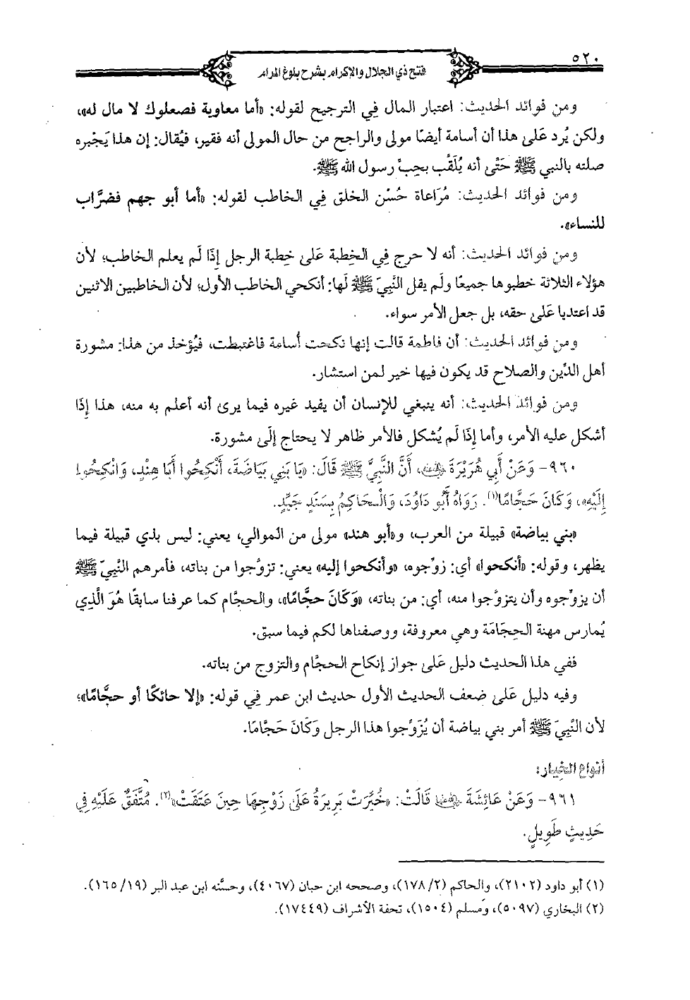 960 - وعن أبي هريرة (رضي الله عنه)، أن النبي (صلى الله عليه وسلم) قال: «يا بني بياضة، أنكحوا أبا هند، وانكحوا إليه» وكان حجاماً. رواه أبو داود، والحاكم بسند جيد. «بني بياضة» قبيلة من العرب، و «أبو هند» مولى من الموالي، يعني: ليس بذي قبيلة فيما يظهر، وقوله: «أنكحوا» أي: زوجوه، «وانكحوا إليه» يعني: تزوجوا من بناته، فأمرهم النبي (صلى الله عليه وسلم) أن يزوجوه وأن يتزوجوا منه، أي: من بناته، «وكان حجاماً»، والحجام كما عرفنا سابقاً هو الذي يمارس مهنة الحجامة وهي معروفة، ووصفناها لكم فيما سبق. ففي هذا الحديث دليل على جواز إنكاح الحجام والتزوج من بناته. وفيه دليل على ضعف الحديث الأول حديث ابن عمر في قوله: «إلا حائكاً أو حجاماً»؛ لأن النبي (صلى الله عليه وسلم) أمر بني بياضة أن يزوجوا هذا الرجل وكان حجاماً.
