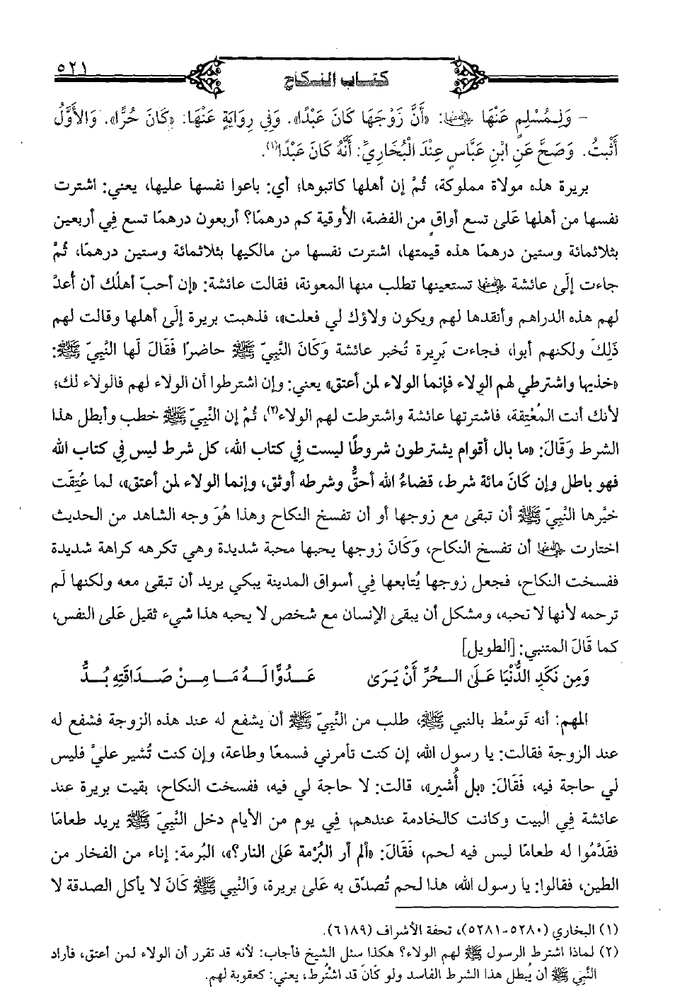- ولمسلم عنها (رضي الله عنه): «أن زوجها كان عبدا». وفي رواية عنها: «كان حراً». والأول أثبت. وصح عن ابن عباس عند البخاري: أنه كان عبداً. بريرة هذه مولاة مملوكة، ثم إن أهلها كاتبوها؛ أي: باعوا نفسها عليها، يعني: اشترت نفسها من أهلها على تسع أواقٍ من الفضة، الأوقية كم درهماً؟ أربعون درهماً تسع في أربعين بثلاثمائة وستين درهماً هذه قيمتها، اشترت نفسها من مالكيها بثلاثمائة وستين درهماً، ثم جاءت إلى عائشة (رضي الله عنها) تستعينها تطلب منها المعونة، فقالت عائشة: «إن أحب أهلك أن أعد لهم هذه الدراهم وأنقدها لهم ويكون ولاؤك لي فعلت»، فذهبت بريرة إلى أهلها وقالت لهم ذلك ولكنهم أبوا، فجاءت بريرة تخبر عائشة وكان النبي (صلى الله عليه وسلم) حاضراً فقال لها النبي (صلى الله عليه وسلم): «خذيها واشترطي لهم الولاء فإنما الولاء لمن أعتق» يعني: وإن اشترطوا أن الولاء لهم فالولاء لك؛ لأنك أنت المعتقة، فاشترتها عائشة واشترطت لهم الولاء، ثم إن النبي (صلى الله عليه وسلم) خطب وأبطل هذا الشرط وقال: «ما بال أقوام يشترطون شروطاً ليست في كتاب الله، كل شرط ليس في كتاب الله فهو باطل وإن كان مائة شرط، قضاء الله أحق وشرطه أوثق، وإنما الولاء لمن أعتق»، لما عتقت خيرها النبي (صلى الله عليه وسلم) أن تبقى مع زوجها أو أن تفسخ النكاح وهذا هو وجه الشاهد من الحديث اختارت (رضي الله عنها) أن تفسخ النكاح، وكان زوجها يحبها محبة شديدة وهي تكرهه كراهة شديدة ففسخت النكاح، فجعل زوجها يتابعها في أسواق المدينة يبكي يريد أن تبقى معه ولكنها لم ترحمه لأنها لا تحبه، ومشكل أن يبقى الإنسان مع شخص لا يحبه هذا شيء ثقيل على النفس، كما قال المتنبي: [الطويل]