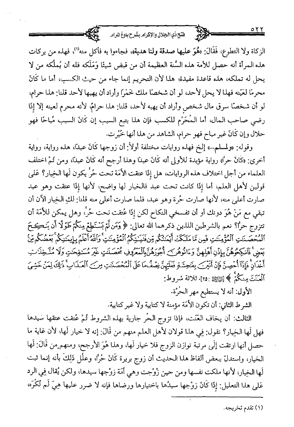 الزكاة ولا التطوع، فقال: «هو عليها صدقة ولنا هدية»، فجاءوا به فأكل منه، فهذه من بركات هذه المرأة أنه حصل للأمة هذه السنة العظيمة أن من قبض شيئاً ومَلَكه فله أن يُملكه من لا يحل له تملكه، هذه قاعدة مفيدة، هذا لأن التحريم إنما جاء من حيث الكسب، أما ما كان محرماً لعينه فهذا لا يحل لأحد، لو أن شخصاً ملك خمراً وأراد أن يهبها لأحد قلنا: هذا حرام، لو أن شخصاً سرق مال شخص وأراد أن يهبه لأحد، قلنا: هذا حرام، لأنه محرم لعينه إلا إذا رضي صاحب المال، أما المحرم للكسب فإن هذا يتبع السبب إن كان السبب مباحاً فهو حلال وإن كان غير مباح فهو حرام، الشاهد من هذا أنها خيرت. وقوله: «ولمسلم ... » إلخ فهذه روايات مختلفة أولاً: أن زوجها كان عبداً، هذه رواية، رواية أخرى: «كان حراً» رواية مؤيدة للأولى أنه كان عبداً وهذا أرجح أنه كان عبداً، ومن ثم اختلف العلماء من أجل اختلاف هذه الروايات، هل إذا عتقت الأمة تحت حر يكون لها الخيار؟ على قولين لأهل العلم، أما إذا كانت تحت عبد فالخيار لها واضح، لأنها إذا عتقت وهو عبد صارت أعلى منه، لأنها صارت حرة وهو عبد، فلما صارت أعلى منه قلنا: لكِ الخيار الآن أن تبقي مع من هو دونك أو أن تفسخي النكاح لكن إذا عتقت تحت حر، وهل يمكن للأمة أن تتزوج حراً؟ نعم بالشرطين اللذين ذكرهما الله تعالى: {وَمَن لَّمْ يَسْتَطِعْ مِنكُمْ طَوْلًا أَن يَنكِحَ الْمُحْصَنَاتِ الْمُؤْمِنَاتِ فَمِن مَّا مَلَكَتْ أَيْمَانُكُم مِّن فَتَيَاتِكُمُ الْمُؤْمِنَاتِ وَاللَّهُ أَعْلَمُ بِإِيمَانِكُم بَعْضُكُم مِّن بَعْضٍ فَانكِحُوهُنَّ بِإِذْنِ أَهْلِهِنَّ وَآتُوهُنَّ أُجُورَهُنَّ بِالْمَعْرُوفِ مُحْصَنَاتٍ غَيْرَ مُسَافِحَاتٍ وَلاَ مُتَّخِذَاتِ أَخْدَانٍ فَإِذَا أُحْصِنَّ فَإِنْ أَتَيْنَ بِفَاحِشَةٍ فَعَلَيْهِنَّ نِصْفُ مَا عَلَى الْمُحْصَنَاتِ مِنَ الْعَذَابِ ذَلِكَ لِمَنْ خَشِيَ الْعَنَتَ مِنكُمْ} [النساء: 25]. ثلاثة شروط: