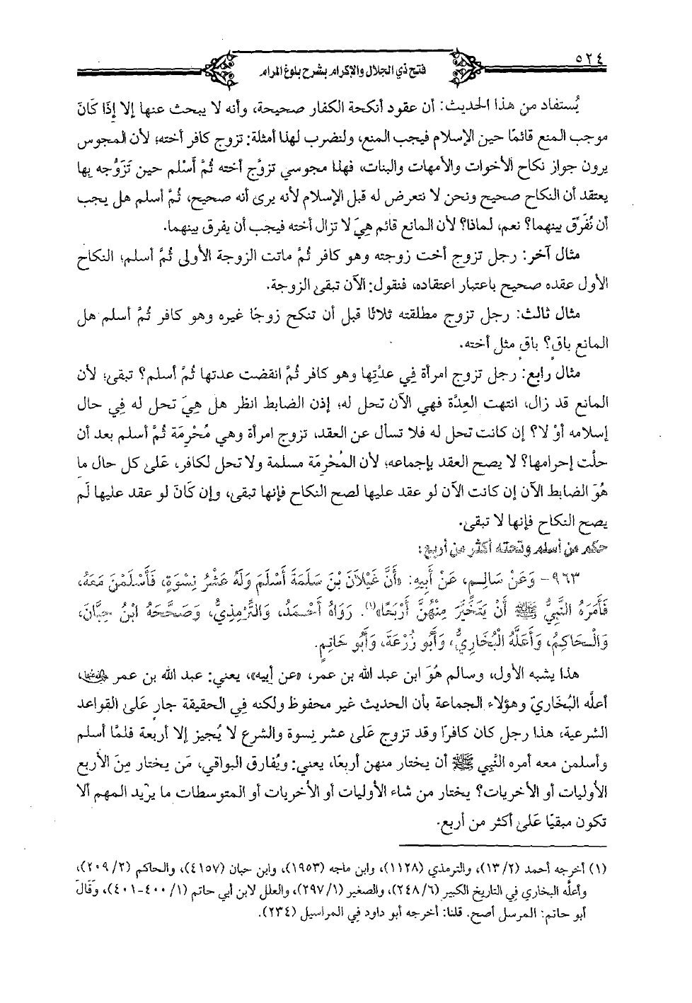 963 - وعن سالم، عن أبيه: «أن غيلان بن سلمة أسلم وله عشر نسوة، فأسلمن معه، فأمره النبي (صلى الله عليه وسلم) أن يتخير منهن أربعاً». رواه أحمد، والترمذي، وصححه ابن حبان، والحاكم، وأعله البخاري، وأبو زرعة، وأبو حاتم. هذا يشبه الأول، وسالم هو ابن عبد الله بن عمر، «عن أبيه» يعني: عبد الله بن عمر (رضي الله عنه) أعله البخاري وهؤلاء الجماعة بأن الحديث غير محفوظ ولكنه في الحقيقة جار على القواعد الشرعية، هذا رجل كان كافراً وقد تزوج على عشر نسوة والشرع لا يجيز إلا أربعة فلما أسلم وأسلمن معه أمره النبي (صلى الله عليه وسلم) أن يختار منهن أربعاً، يعني: ويفارق البواقي، من يختار من الأربع الأوليات أو الأخريات؟ يختار من شاء الأوليات أو الأخريات أو المتوسطات ما يريد المهم ألا تكون مبقياً على أكثر من أربع.