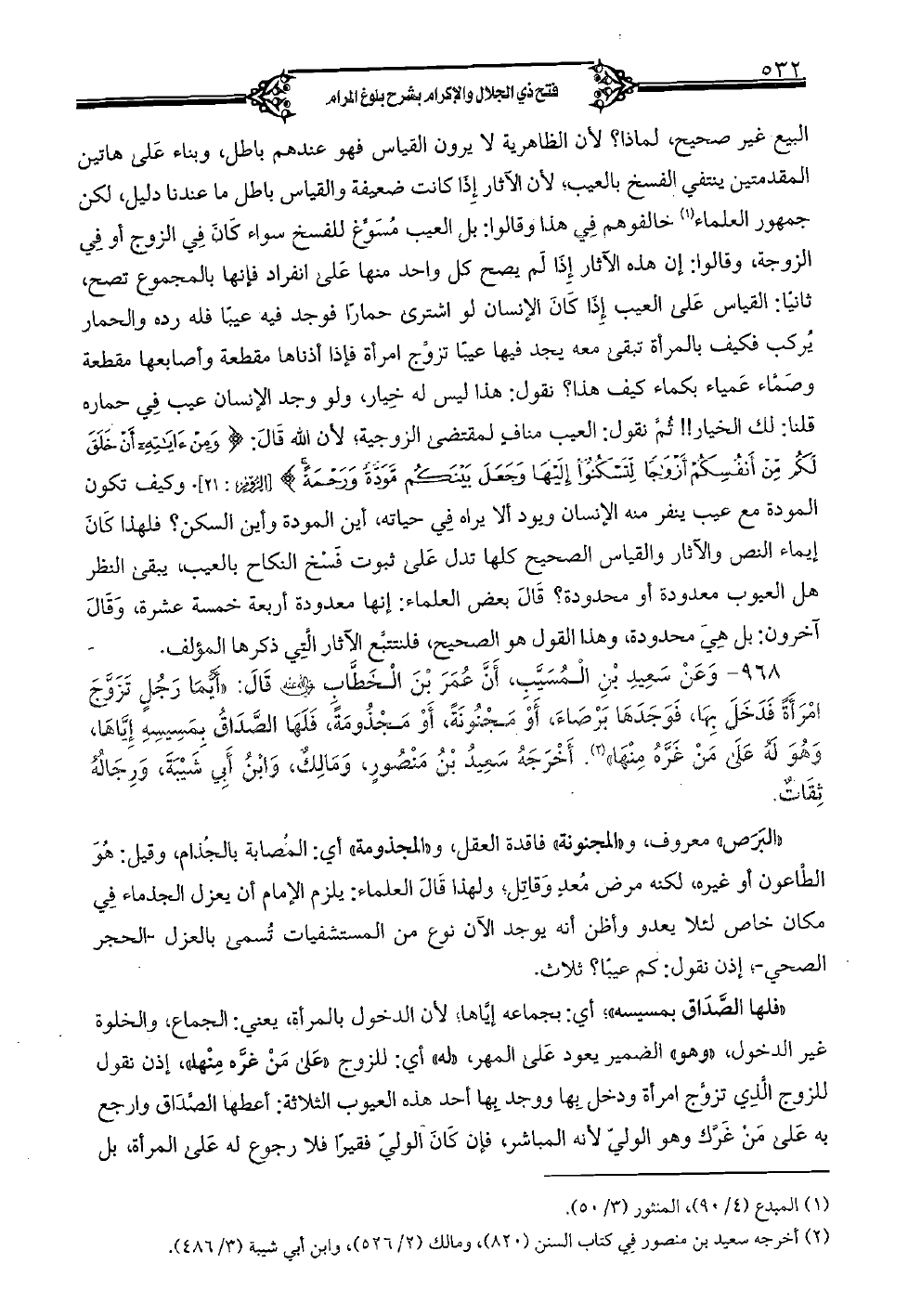 968 - وعن سعيد بن المسيب، أن عمر بن الخطاب (رضي الله عنه) قال: «أيما رجلٍ تزوج امرأة فدخل بها، فوجدها برصاء، أو مجنونة، أو مجذومة، فلها الصداق بمسيسه إياها، وهو له على من غره منها». أخرجه سعيد بن منصور، ومالك، وابن أبي شيبة، ورجاله ثقات. «البرص» معروف، و «المجنونة» فاقدة العقل، و «المجذومة» أي: المصابة بالجذام، وقيل: هو الطاعون أو غيره، لكنه مرض معدٍ وقاتل، ولهذا قال العلماء: يلزم الإمام أن يعزل الجدماء في مكان خاص لئلا يعدو وأظن أنه يوجد الآن نوع من المستشفيات تسمى بالعزل -الحجر الصحي-؛ إذن نقول: كم عيباً؟ ثلاث. «فلها الصداق بمسيسه» أي: بجماعة إياها، لأن الدخول بالمرأة، يعني: الجماع، والخلوة غير الدخول، «وهو» الضمير يعود على المهر، «له»: أي: للزوج «على من غره منها»، إذن نقول للزوج الذي تزوج امرأة ودخل بها ووجد بها أحد هذه العيوب الثلاثة: أعطها الصداق وارجع به على من غرك وهو الولي لأنه المباشر، فإن كان الولي فقيراً فلا رجوع له على المرأة، بل