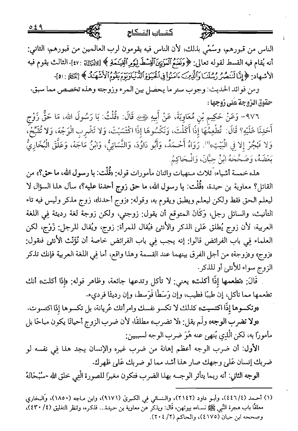 976 - وعن حكيم بن معاوية، عن أبيه (رضي الله عنه) قال: «قلت: يا رسول الله، ما حق زوج أحدنا عليه؟ قال: تطعمها إذا أكلت، وتكسوها إذا اكتسيت، ولا تضرب الوجه، ولا تقبح، ولا تهجر إلا في البيت». رواه أحمد، وأبو داود، والنسائي، وابن ماجه، وعلق البخاري بعضه، وصححه ابن حبان، والحاكم. هذه خمسة أشياء؛ ثلاث منهيات واثنان مأمورات قوله: «قلت: يا رسول الله، ما حق؟ » من القائل؟ معاوية بن حيدة، «قلت: يا رسول الله، ما حق زوج أحدنا عليه؟ » سأل هذا السؤال لا ليعلم الحق فقط ولكن ليعلم ويطبق ويقوم به، وقوله: «زوج أحدنا»، زوج مذكر وليس فيه تاء التأنيث، والسائل رجل، وكان المتوقع أن يقول: زوجتي، ولكن زوجة لغة رديئة في اللغة العربية؛ لأن زوج يطلق على الذكر والأنثى فيقال للمرأة: زوج، ويقال للرجل: زوج، لكن العلماء في باب الفرائض قالوا: إنه يجب في باب الفرائض خاصة أن تؤنث الأنثى فنقول: «زوج» و «زوجة» من أجل الفرق بينهما عند القسمة وهذا واقع، أما في اللغة العربية فإنك تذكر الزوج سواء للأنثى أو للذكر. قال: «تطعمها إذا أكلت» يعني: لا تأكل وتدعها جائعة، وظاهر قوله: «إذا أكلت» أنك تطعمها مما تأكل، إن طيباً فطيب، وإن وسطاً فوسط، وإن رديئاً فرديء. «وتكسوها إذا اكتسيت» كذلك لا تكسو نفسك وامرأتك عريانة، بل تكسوها إذا اكتسوت. «ولا تضرب الوجه» ولم يقل: «لا تضرب» مطلقاً؛ لأن ضرب الزوج أحياناً يكون مباحاً بل مأموراً به، لكن الذي ينهى عنه هو ضرب الوجه لسببين: