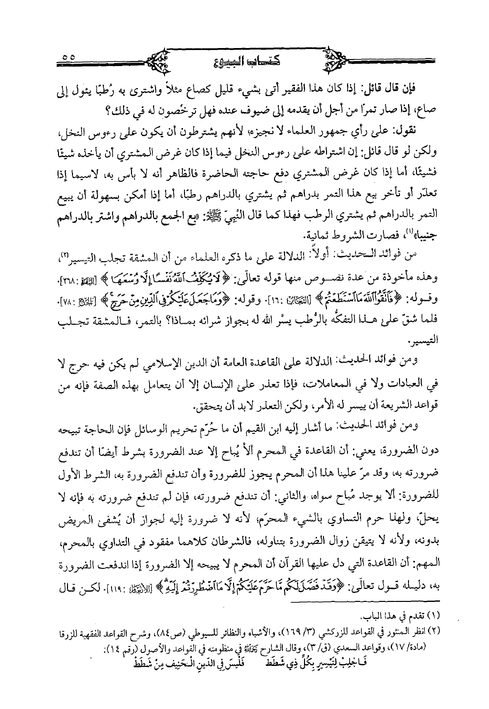 ومن فوائد الحديث: الدلالة على القاعدة العامة أن الدين الإسلامي لم يكن فيه حرج لا في العبادات ولا في المعاملات، فإذا تعذر على الإنسان إلا أن يتعامل بهذه الصفة فإنه من قواعد الشريعة أن ييسر له الأمر، ولكن التعذر لابد أن يتحقق.