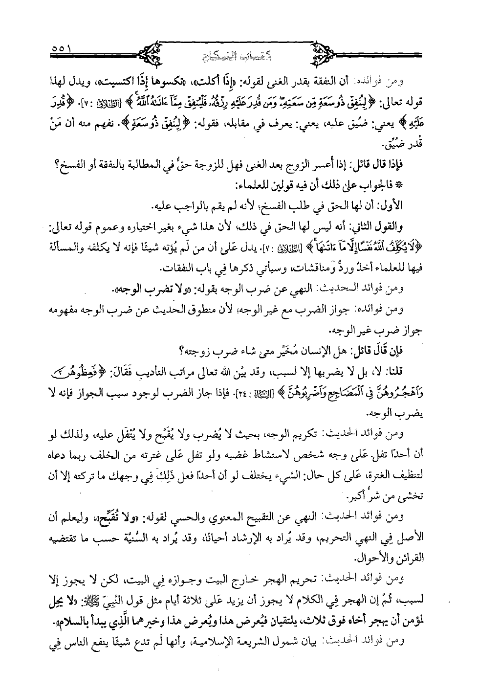 ومن فوائده: أن النفقة بقدر الغنى لقوله: {إذا أكلت} {تكسوها إذا اكتسبت} , ويدل قوله تعالى: {لينفق ذو سعة من سعته ومن قدر عليه رزقه فلينفق مما آتاه الله} [الطلاق: 7] {قدر عليه} يعني: ضيق عليه, يعني: في مقابله, فقوله: {لينفق ذو سعة}. نفهم منه أن من قدر ضيق. فإذا قال قائل: إذا أعسر الزوج بعد الغنى فهل للزوجة حق في المطالبة بالنفقة أو الفسخ؟
