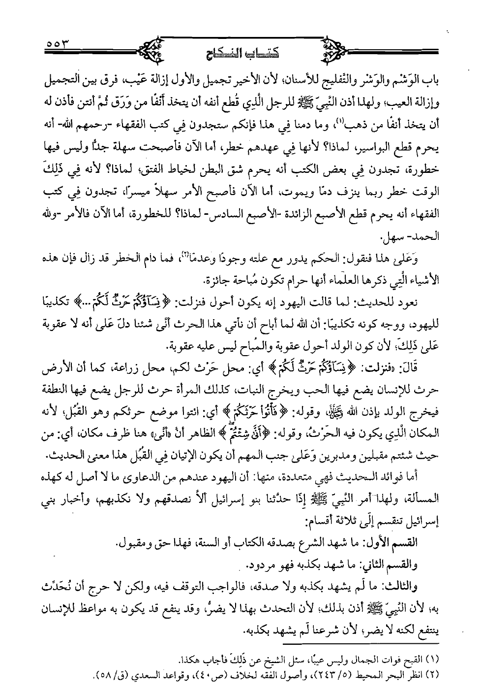 نعود للحديث: لماذا قالت اليهود أنه يكون أحول فنزلت: {نساؤكم حرث لكم .. } تكذيبًا لليهود, ووجه كونه تكذيبًا: أن الله لما أباح أن نأتي هذا الحرث أنى شئنا دل على أنه لا عقوبة على ذلك؛ لأن كون الولد أحول عقوبة والمباح ليس عليه عقوبة. قال: "فنزلت: {نساؤكم حرث لكم} أي: محل حرث لكم, محل زراعة, كما أن الأرض حرث للإنسان يضع فيها الحب ويخرج النبات, كذلك المرأة حرث للرجل يضع فيها النطفة فيخرج الولد بإذن الله عز وجل, وقوله: {أنى شئتم} الظاهر أن "أنى" هنا ظرف مكان, أي: من حيث شئتم مقبلين ومدبرين وعلى جنب المهم أن يكون الإتيان في القبل هذا معنى الحديث. أما فوائد الحديث فهي متعددة منها: أن اليهود عندهم من الدعاوى ما لا أصل له كهذه المسألة, ولهذا أمر النبي صلى الله عليه وسلم إذا حدثنا بنو إسرائيل ألا نصدقهم ولا نكذبهم, وأخبار بني إسرائيل تنقسم إلى ثلاثة أقسام: