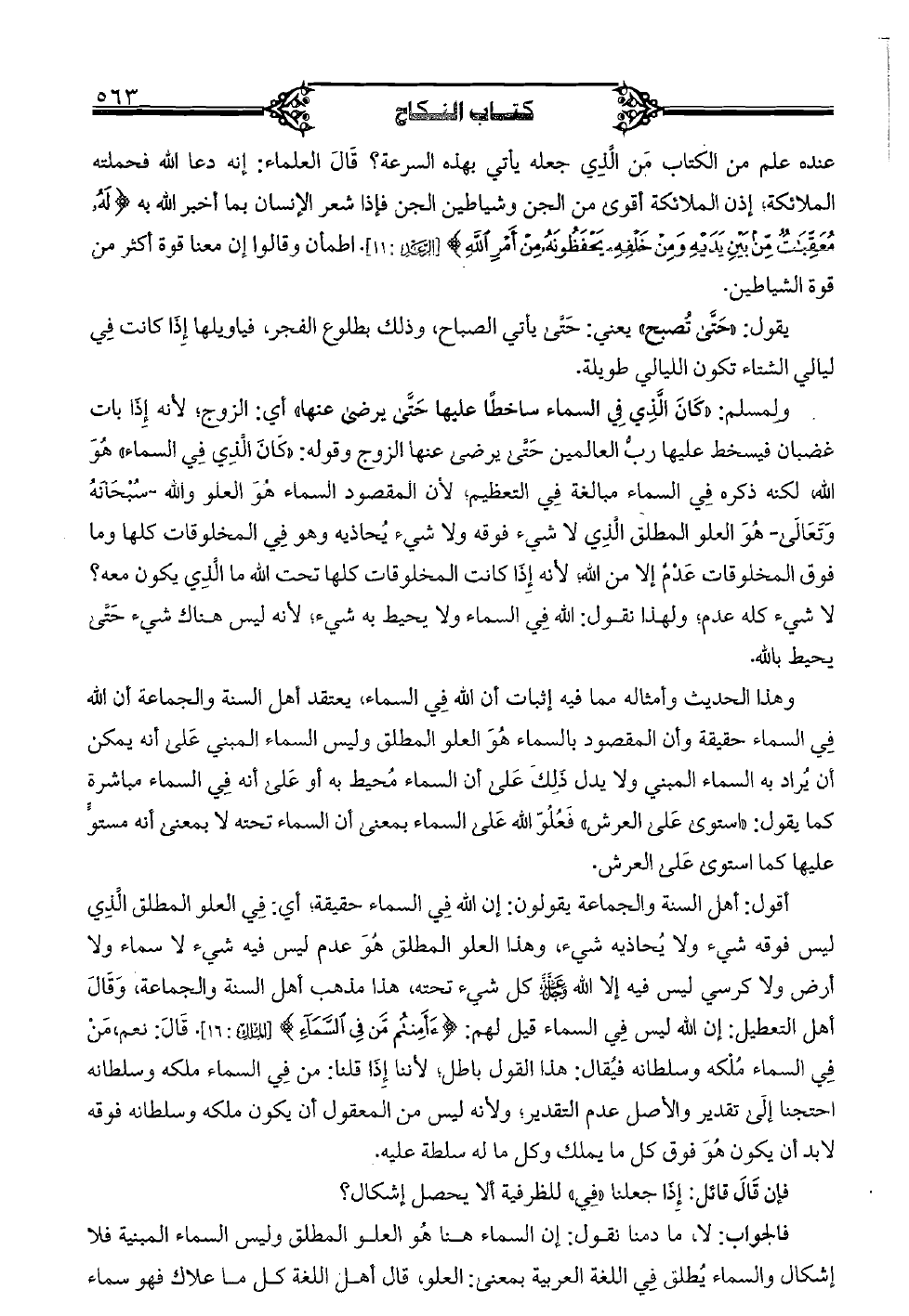 عنده علم من الكتاب من الذي جعله يأتي بهذه السرعة؟ قال العلماء: إنه دعا الله فحملته الملائكة إذن الملائكة أقوى من الجن وشياطين الجن فإذا شعر الإنسان بما أخبر الله به {له معقبات من بين يديه ومن خلفه يحفظونه من أمر الله} [الرعد: 11]. اطمأن وقالوا إن معنا قوة أكثر من قوة الشياطين. يقول: "حتى تصبح" يعني حتى يأتي الصباح, ذلك بطلوع الفجر, فياويلها إذا كانت في ليالي الشتاء تكون الليالي طويلة. ولمسلم: "كان الذي في السماء ساخطًا عليها حتى يرضى عنها" أي: الزوج؛ لأنه إذا بات غضبان فيسخط عليها رب العالمين حتى يرضى عنها الزوج وقوله: "كان الذي في السماء" هو الله, لكنه ذكره في السماء مبالغة في التعظيم؛ لأن المقصود السماء هو العلو والله -سبحانه وتعالى- هو العلو المطلق الذي لا شيء فوقه ولا شيء يحاذيه وهو في المخلوقات كلها وما فوق المخلوقات عدم إلا من الله؛ لأنه إذا كانت المخلوقات كلها تحت الله ما الذي يكون معه؟ لا شيء كله عدم؛ ولهذا نقول: الله في السماء ولا يحيط به شيء؛ لأنه ليس هناك شيء حتى يحيط بالله. وهذا الحديث وأمثاله مما فيه إثبات أن الله في السماء, يعتد أهل السنة والجماعة أن الله في السماء حقيقة وأن المقصود بالسماء هو العلو المطلق وليس السماء المبنى على أنه يمكن أن يراد به السماء المبنى ولا يدل ذلك على أن السماء محيط به أو على أنه في السماء مباشرة كما يقول: "استوى على العرش" فعلو الله على السماء بمعنى أن السماء تحته لا بمعنى أنه مستو عليها كما استوى على العرش. أقول: أهل السنة والجماعة يقولون: إن الله في السماء حقيقة؛ في العلو المطلق الذي ليس فوقه شيء ولا يحاذيه شيء, وهذا العلو المطلق هو عدم ليس فيه شيء لا سماء ولا أرض ولا كرسي ليس فيه إلا الله عز وجل كل شيء تحته, هذا مذهب أهل السنة والجماعة, وقال أهل التعطيل: إن الله ليس في السماء قيل لهم: {ءأمنتم من في السماء} [الملك: 16]. قال: نعم, من في السماء ملكه وسلطانه فيقال: هذا القول باطل؛ لأننا إذا قلنا: من في السماء ملكه وسلطانه احتجنا إلى تقدير والأصل عدم التقدير؛ ولأنه ليس من المعقول أن يكون ملكه وسلطانه فوقه لابد أن يكون هو فوق كل ما يملك وكل ما له سلطان عليه. فإن قال قائل: إذا جعلنا "في" للظرفية ألا يحصل إشكال؟