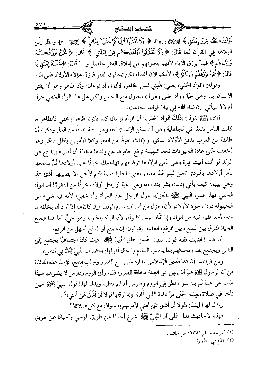 أولادكم من إملاق} [الأنعام: 151]. {ولا تقتلوا أولادكم خشية إملاق} [الإسراء: 31]. وانظر إلى البلاغة في القرآن لما قال: {ولا تقتلوا أولادكم من إملاق} قال: {نحن نرزقكم وإياهم} فبدأ برزق الآباء لأنهم يقتلونهم من إملاق الفقر حاصل ولما قال: {خشية إملاق} قال: {نحن نرزقهم وإياكم}؛ لأنكم الآن أغنياء لكن تخافون الفقر فرزق هؤلاء الأولاد على الله. وقوله: "الوأد الخفي" يعني: الذي بظاهر؛ لأن الوأد نوعان: وأد ظاهر وهو أن يقتل الإنسان ابنته وهي حية ووأد خفي وهو أن يحاول منع الحمل ولكن هل هذا الوأد الخفي حرام أم لا؟ سيأتي -إن شاء الله- في بيان فوائد الحديث. أفادنا صلى الله عليه وسلم بقوله: "ذلك الوأد الخفي": أن الوأد نوعان كما ذكرنا ظاهر وخفي فالظاهر ما كانت الناس تفعله ف الجاهلية وهو: أن يدفن الإنسان ابنته وهي حية خوفًا من العار وذكرنا أن طائفة من العرب تدفن الأولاد الذكور والإناث خوفًا من الفقر وكلا الأمرين باطل منكر وهو يخالف حتى عادة الحيوانات نجد البهيمة ترفع حافرها عن ولدها مخافة أن تصيبه وتدافع عن الولد لو أنك أتيت هرة وهي على أولادها ترضعهم تهاجمك خوفًا على أولادها ثم تسمعها تأمر أولادها بالتردي تحن لهم حنا معينا؛ يعني: اخلوا مساكنكم لأجل ألا يصيبهم أذى هذا الخفي فهذا فسره صلى الله عليه وسلم بالعزل, عزل الرجل عن المرأة وأد خفي؛ لأنه فيه شيء من الحيلولة دون وجود الأولاد؛ لأن العزل من أسباب عدم الولد, وإن كان الله إذا أراد أن يخلقه ما متعه أحد ففيه شبه من الوأد وإن كان ليس كالوأد؛ لأن الوأد يدفنونه وهو حي, أما هذا فيمنع الحياة ففرق بين المنع وبين الرفع, العلماء يقولون: إن المنع أو الدفع أسهل من الرفع. أما هذا الحديث ففيه فوائد منها: حسن خلق النبي صلى الله عليه وسلم حيث كان اجتماعيًا يجتمع إلى الناس ويجتمع بهم ويحدثهم بما يناسب المقام والحال لقولها: "حضرت النبي صلى الله عليه وسلم في أناس". ومن فوائده: أن هذا الدين الإسلامي مداره على منع الضرر وجلب النفع, تؤخذ هذه الفائدة من أن الرسول صلى الله عليه وسلم هم أن ينهي عن الغيلة مخافة الضرر, فلما رأى الروم وفارس لا يضرهم شيئًا عدل عن هذا لم ينه سواء نظر في الروم وفارس أم لم ينظر, ويدل لهذا قول النبي صلى الله عليه وسلم حين تأخر في صلاة العشاء حتى مر عامة الليل قال: "إنه لوقتها لولا أن أشق على أمتي". ويدل لهذا أيضًا: "لولا أن أشق على أمتي لأمرتهم بالسواك مع كل صلاة". فهذه الأحاديث تدل على أن النبي صلى الله عليه وسلم يشرع أحيانًا عن طريق الوحي وأحيانًا عن طريق