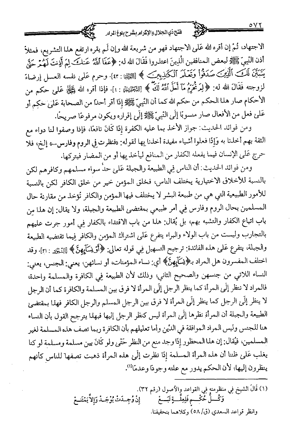 الاجتهاد, ثم إن أقره الله على الاجتهاد فهو من شريعة الله وإن لم يقره ارتفع هذا التشريع, فمثلاً أذن النبي صلى الله عليه وسلم لبعض المنافقين الذين اعتذروا فقال الله له: {عفا الله عنك لم أذنت لهم حتى يتبين لك الذين صدقوا وتعلم الكاذبين} [التوبة: 43]. وحرم على نفسه العسل إرضاء لزوجته فقال الله له: {لم تحرم ما أحل الله لك} [التحريم: 1]. فإذا أقره الله عز وجل على حكم من الأحكام صار هذا الحكم من حكم الله كما أن النبي صلى الله عليه وسلم إذا أقر أحدًا من الصحابة على حكم أو على فعل من الأفعال صار منسوبًا إلى النبي صلى الله عليه وسلم إلى إقراره ويكون مرفوعًا صريحًا.