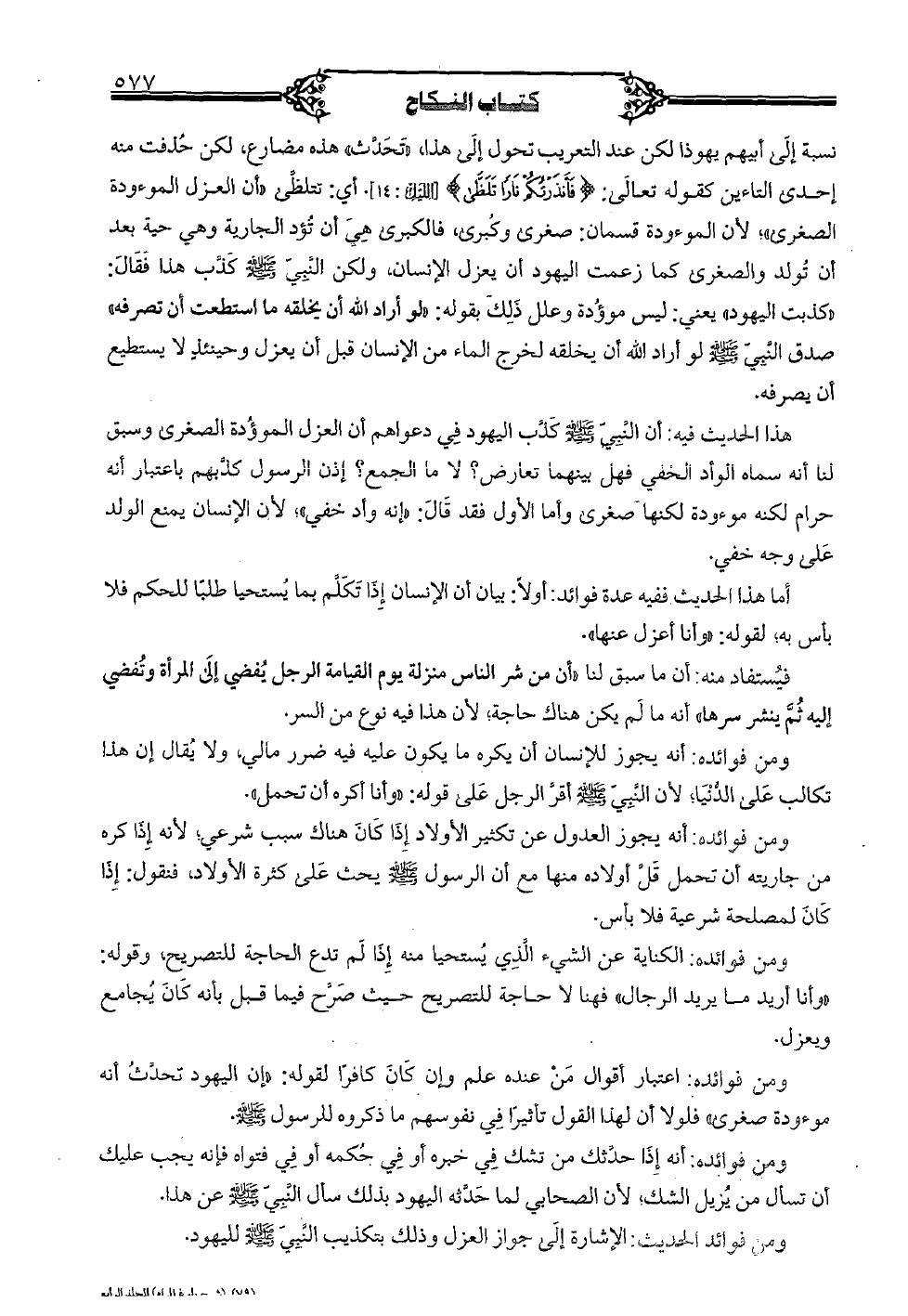 نسبة إلى أبيهم يهوذا لكن عند التعريب تحول إلى هذا, "تحدث" هذه مضارع, لكن حذفت منه إحدى التاءين كقوله تعالى: {فأنذرتكم نارًا تلظى} [الليل: 14]. أي: "أن العزل الموءودة الصغرى"؛ لأن الموءودة قسمان: صغرى وكبرى, فالكبرى هي أن تؤد الجارية وهي حية بعد أن تولد والصغرى كما زعمت اليهود أن يعزل الإنسان, ولكن النبي صلى الله عليه وسلم كذب هذا فقال: "كذبت اليهود" يعني: ليس موؤدة وعلل ذلك بقوله: "لو أراد الله أن يخلقه ما استطعت أن تصرفه" صدق النبي صلى الله عليه وسلم لو أراد الله أن يخلقه لخرج الماء من الإنسان قبل أن يعزل وحينئذ لا يستطيع أن يصرفه. هذا الحديث فيه: أن النبي صلى الله عليه وسلم كذب اليهود في دعواهم أن العزل الموؤدة الصغرى وسبق لنا أنه سماه الوأد الخفي فهل بينهما تعارض؟ لا ما الجمع؟ إذن الرسول كذبهم باعتبار أنه حرام لكنه موءودة لكنها صغرى وأما الأول فقد قال: "إنه وأد خفي"؛ لأن الإنسان يمنع الولد على وجه خفي. أما هذا الحديث ففيه عدة فوائد: أولاً: بيان أن الإنسان إذا تكلم بما يستحيا طلباً للحكم فلا بأس به؛ لقوله: "وأنا أعزل عنها". فيستفاد منه: أن ما سبق لنا "أن من شر الناس منزلة يوم القيامة الرجل يفضي إلى المرأة وتفضي إليه ثم ينشر سرها" أنه ما لم يكن هناك حاجة؛ لأن هذا فيه نوع من السر. ومن فوائده: أنه يجوز للإنسان أن يكره ما يكون عليه فيه ضرر مالي, ولا يقال إن هذا تكالب على الدنيا؛ لأن النبي صلى الله عليه وسلم أقر الرجل على قوله: "وأنا أكره أن تحمل". ومن فوائده: أنه يجوز العدول عن تكثير الأولاد إذا كان هناك سبب شرعي؛ لأنه إذا كره من جاريته أن تحمل قل أولاده منها مع أن الرسول صلى الله عليه وسلم يحث على كثرة الأولاد فنقول: إذا كان لمصلحة شرعية فلا بأس. ومن فوائده: الكناية عن الشيء الذي يستحيا منه إذا لو تدع الحاجة للتصريح, قوله "وأنا أريد ما يريد الرجال" فهنا لا حاجة للتصريح حيث صرح فيما قبل بأنه كان يجامع ويعزل. ومن فوائده: اعتبار أقوال من عنده علم وإن كان كافرًا لقوله: "إن اليهود تحدث أنه موءودة صغرى" فلولا أن لهذا القول تأثيرًا في نفوسهم ما ذكروه للرسول صلى الله عليه وسلم. ومن فوائده: أنه إذا حدثك من تشك في خبره أو في حكمه أو في فتواه فإنه يجب عليك أن تسأل من يزيل الشك, لأن الصحابي لما حدثه اليهود بذلك سأل النبي عن هذا. ومن فوائد الحديث: الإشارة إلى جواز العزل وذلك بتكذيب النبي صلى الله عليه وسلم لليهود.