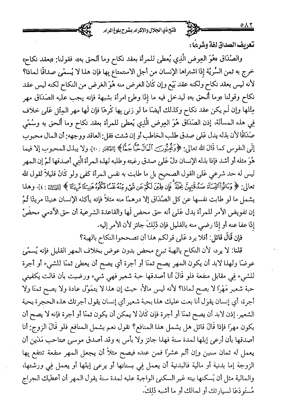 والصَّدَاق «هو العوض الذي يعطى للمرأة بعقد نكاح وما ألحق به»، فقولنا: «بعقد نكاح» خرج به ثمن السرية إذا اشتراها الإنسان من أجل الاستمتاع بها فإن هذا لا يسمى صداقًا لماذا؟ لأنه ليس بعقد نكاح ولكنه عقد بيع وإن كان الغرض منه هو الغرض من النكاح لكنه ليس عقد نكاح وقولنا «وما ألحق به» ليدخل فيه ما إذا وطئ امرأة بشبهة فإنه يجب عليه الصَدَاق مهر مثلها وإن لم يكن عقد نكاح وكذلك أيضًا ما لو زنى بها كرهًا فإن لها مهر المثل على خلاف في هذه المسألة، إذن الصَدَاق هو العوض الذي يعطى للمرأة بعقد نكاح وما ألحق به وسمي صَدَاقًا لأن بذله يدل على صدق طلب الخاطب أو إن شئت فقل: العاقد ووجهه: أن المال محبوب إلى النفوس كما قال الله تعالى: {وَتُحِبُّونَ الْمَالَ حُبًّا جَمًّا} [الفجر: 20]. ولا يبذل المحبوب إلا فيما هو مثله أو أشد فإذا بذله الإنسان دل على صدق رغبته وطلبه لهذه المرأة التي أصدقها ثم إن المهر ليس له حد شرعي على القول الصحيح بل ما طابت به نفس المرأة كفى ولو كان قليلًا لقول الله تعالى: {وَآتُوا النِّسَاءَ صَدُقَاتِهِنَّ نِحْلَةً فَإِنْ طِبْنَ لَكُمْ عَنْ شَيْءٍ مِنْهُ نَفْسًا فَكُلُوهُ هَنِيئًا مَرِيئًا} [النساء: 4]. وهذا يشمل ما لو طابت نفسها عن كل الصَّدَاق إلا درهمًا منه مثلًا فإنه يأكله الإنسان هنيئًا مريئًا ثم إن تفويض الأمر للمرأة يدل على أنه حق محض لها والقاعدة الشرعية أن حق الآدمي محضٌ إذا عفا عنه أو إذا رضي منه بالقليل فإن ذلك جائز لأن الأمر إليه.