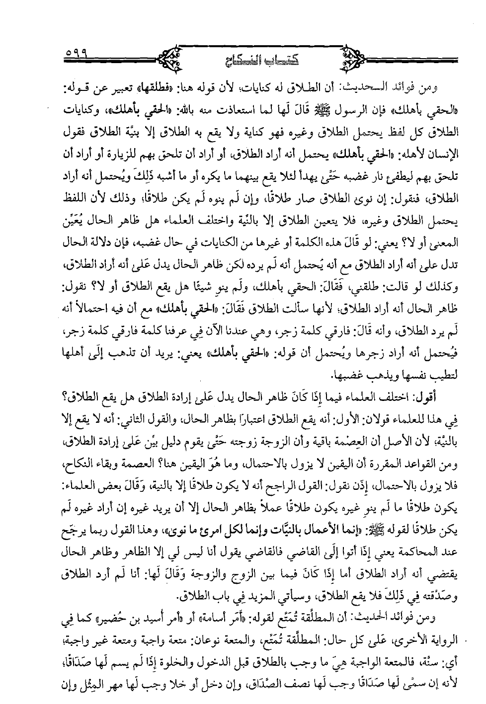 أقول: اختلف العلماء فيما إذا كان ظاهر الحال يدل على إرادة الطلاق هل يقع الطلاق؟ في هذا للعلماء قولان: الأول: أنه يقع الطلاق اعتبارًا بظاهر الحال، والقول الثاني: أنه لا يقع إلا بالنية؛ لأن الأصل أن العصمة باقية وأن الزوجة زوجته حتى يقوم دليل بيِّن على إرادة الطلاق، ومن القواعد المقررة أن اليقين لا يزول بالاحتمال، وما هو اليقين هنا؟ العصمة وبقاء النكاح، فلا يزول بالاحتمال، إذن نقول: القول الراجح أنه لا يكون طلاقًا إلا بالنية، وقال بعض العلماء: يكون طلاقًا ما لم ينو غيره يكون طلاقًا عملًا بظاهر الحال إلا أن يريد غيره إن أراد غيره لم يكن طلاقًا لقوله صلى الله عليه وسلم: «إنما الأعمال بالنيات وإنما لكل امرئ ما نوى»، وهذا القول ربما يرجح عند المحاكمة يعني إذا أتوا إلى القاضي فالقاضي يقول أنا ليس لي إلا الظاهر وظاهر الحال يقتضي أنه أراد الطلاق أما إذا كان فيما بين الزوج والزوجة وقال لها: أنا لم أرد الطلاق وصدَّقته في ذلك فلا يقع الطلاق، وسيأتي المزيد في باب الطلاق.