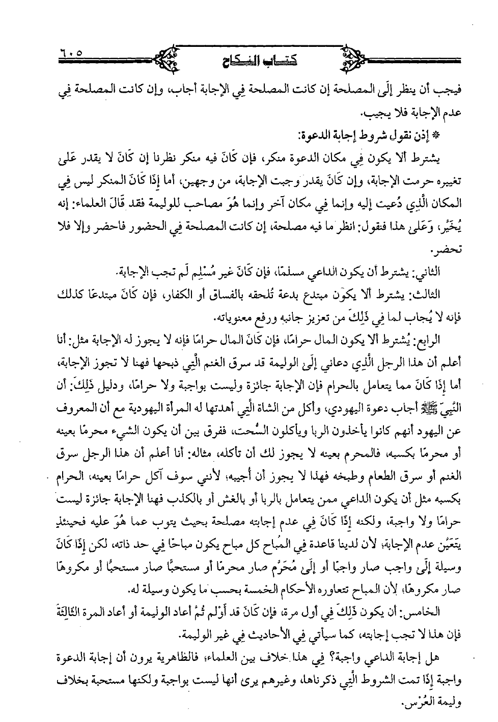 الرابع: يشترط ألا يكون المال حراماً, فإن كان المال حراماً فإنه لا يجوز له الإجابة مثل: أنا أعلم أن هذا الرجل الذي دعاني إلى الوليمة قد سرق الغنم التي ذبحها فهنا لا تجوز الإجابة, أما إذا كان مما يتعامل بالحرام فإن الإجابة جائزة وليست بواجبة ولا حراماً, ودليل ذلك: أن النبي صلى الله عليه وسلم أجاب دعوة اليهودي, وأكل من الشاة التي أهدتها له المرأة اليهودية مع أن المعروف عن اليهود أنهم كانوا يأخذون الربا ويأكلون السُحت, ففرق بين أن يكون الشيء محرماً بعينه أو محرماً بكسبه, فالمحرم بعينه لا يجوز لك أن تأكله, مثاله: أنا أعلم أن هذا الرجل سرق الغنم أو سرق الطعام وطبخه فهذا لا يجوز أن أجيبه, لأنني سوف آكل حراماً بعينه, الحرام بكسبه مثل أن يكون الداعي ممكن يتعامل بالربا أو بالغش أو بالكذب فهنا الإجابة جائزة ليست حراماً ولا واجبة, ولكنه إذا كان في عدم إجابته مصلحة بحيث يتوب عما هو عليه فحينئذٍ يتعين عدم الإجابة, لأن لدينا قاعدة في المباح كل مباح يكون مباحاً في حد ذاته, لكن إذا كان وسيلة إلى واجب صار واجباً أو إلى محرم صار محرماً أو مستحباً صار مستحباً أو مكروهاً صار مكروهاً, لأن المباح تتعاوره الأحكام الخمسة بحسب ما يكون وسيلة له.