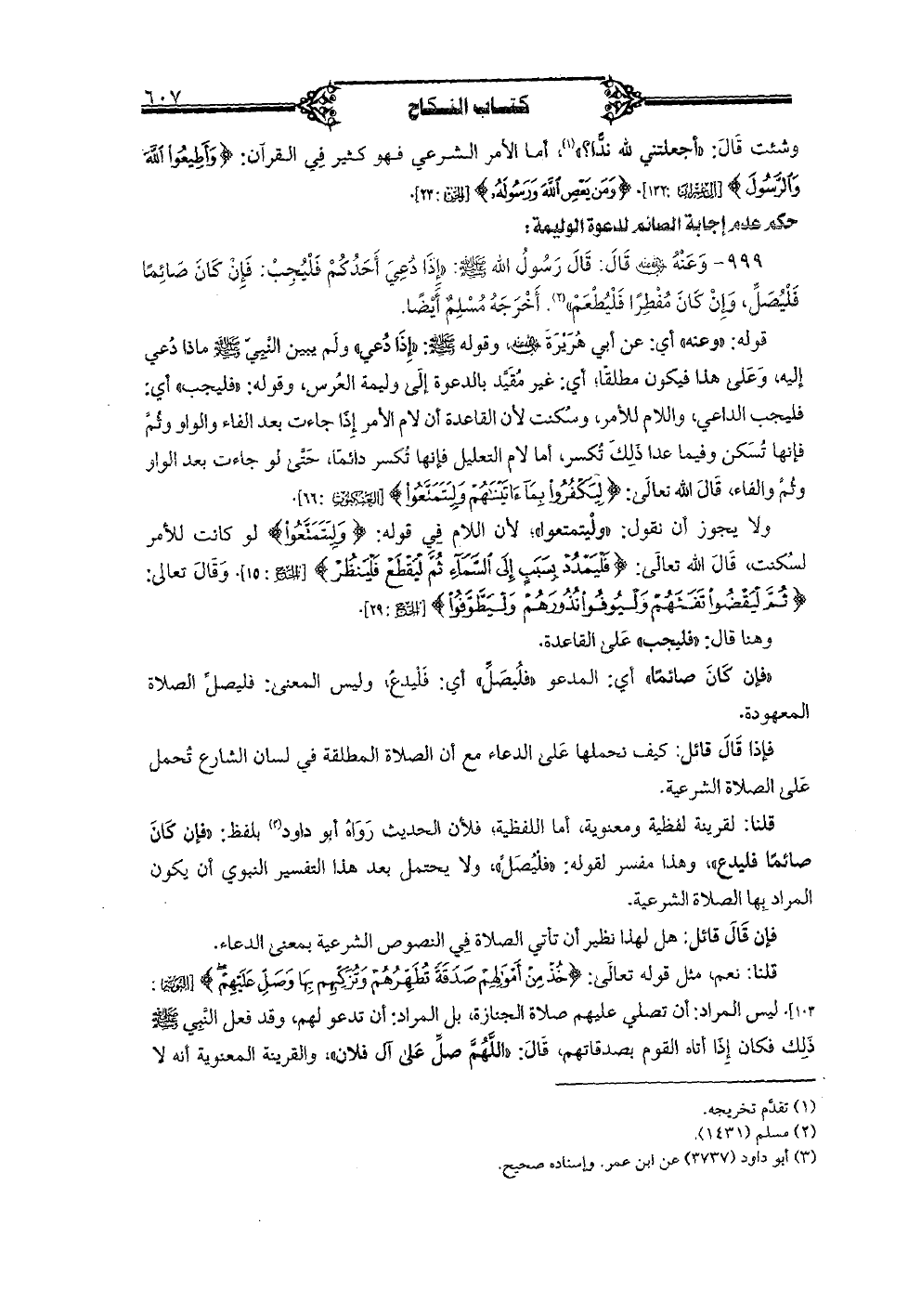 999 - وعنه رضي الله عنه قال: قال رسول لله صلى الله عليه وسلم: «إذا دُعِيَ أحدكم فليُجب: فإن كان صائماً فليصلََّ, وإن كان مفطر فليطعم». أخرجه مسلم أيضًا.