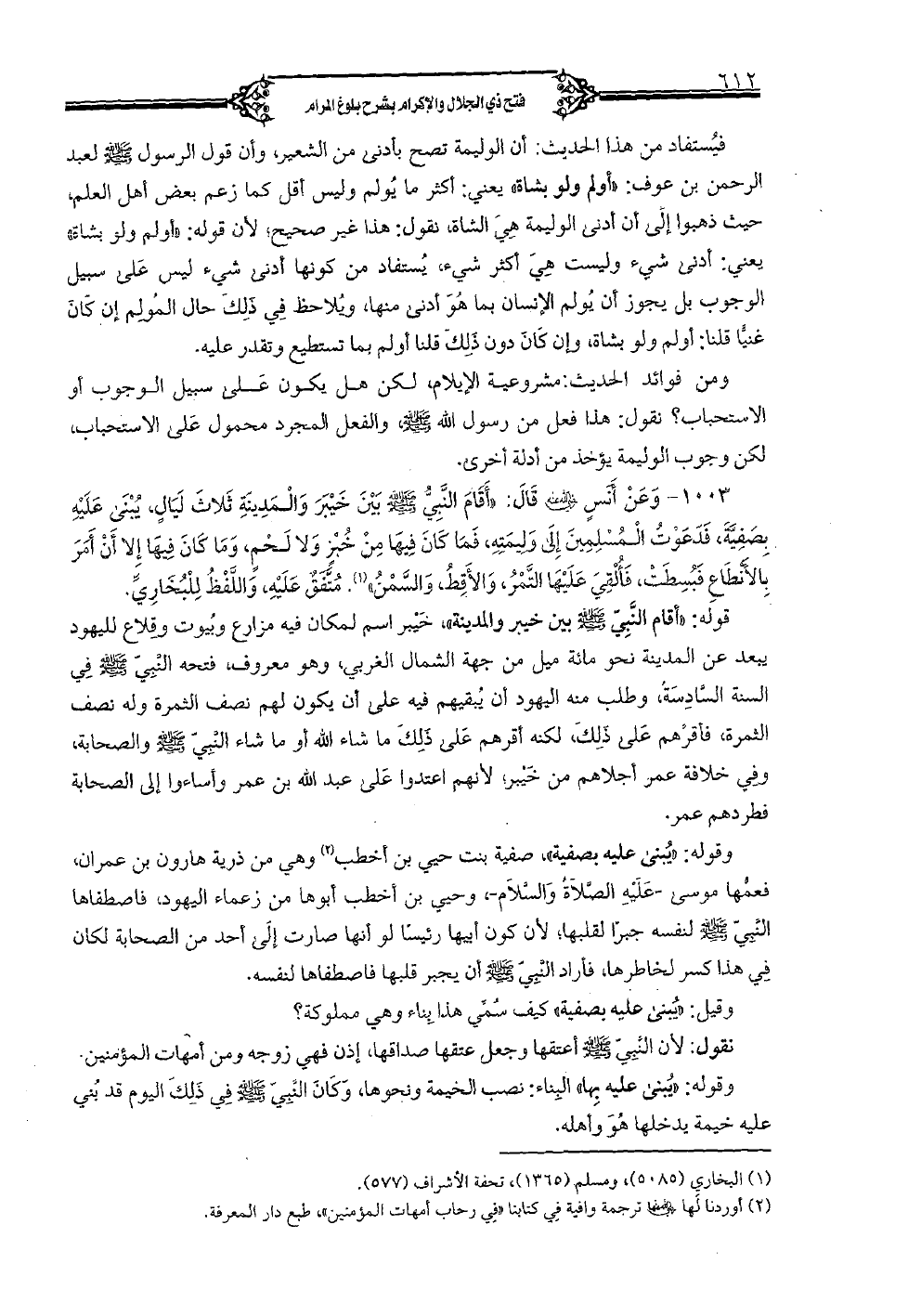 1003 - وعن أنس رضي الله عنه قال: «أقام النبي صلى الله عليه وسلم بين خيبر والمدينة ثلاث ليالٍ يُبنى عليه بصفية, فدعوت المسلمين إلى وليمته, فما كان فيها من خبز ولا لحم, وما كان فيها إلا أن أمر بالأنطاع فبسطت, فألقي عليها التمر, والأقط, والسمن». متفق عليه, واللفظ للبخاري.